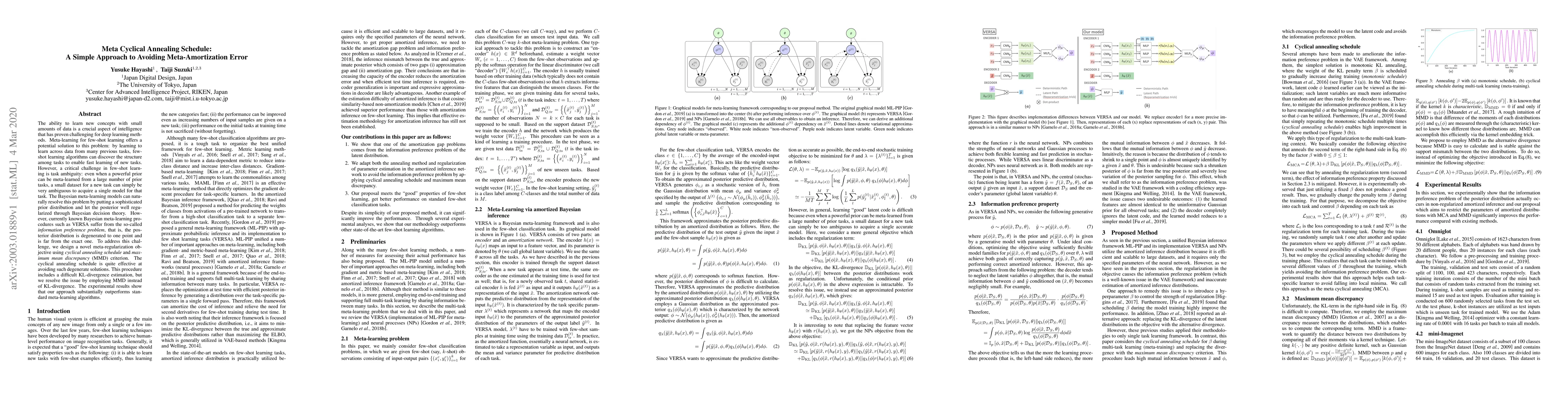 The ability to learn new concepts with small amounts of data is a crucial aspect of intelligence that has proven challenging for deep learning methods. Meta-learning for few-shot learning offers a potential solution to this problem: by learning to learn across data from many previous tasks, few-shot learning algorithms can discover the structure among tasks to enable fast learning of new tasks. However, a critical challenge in few-shot learning is task ambiguity: even when a powerful prior can be meta-learned from a large number of prior tasks, a small dataset for a new task can simply be very ambiguous to acquire a single model for that task. The Bayesian meta-learning models can naturally resolve this problem by putting a sophisticated prior distribution and let the posterior well regularized through Bayesian decision theory. However, currently known Bayesian meta-learning procedures such as VERSA suffer from the so-called {\it information preference problem}, that is, the posterior distribution is degenerated to one point and is far from the exact one. To address this challenge, we design a novel meta-regularization objective using {\it cyclical annealing schedule} and {\it maximum mean discrepancy} (MMD) criterion. The cyclical annealing schedule is quite effective at avoiding such degenerate solutions. This procedure includes a difficult KL-divergence estimation, but we resolve the issue by employing MMD instead of KL-divergence. The experimental results show that our approach substantially outperforms standard meta-learning algorithms.