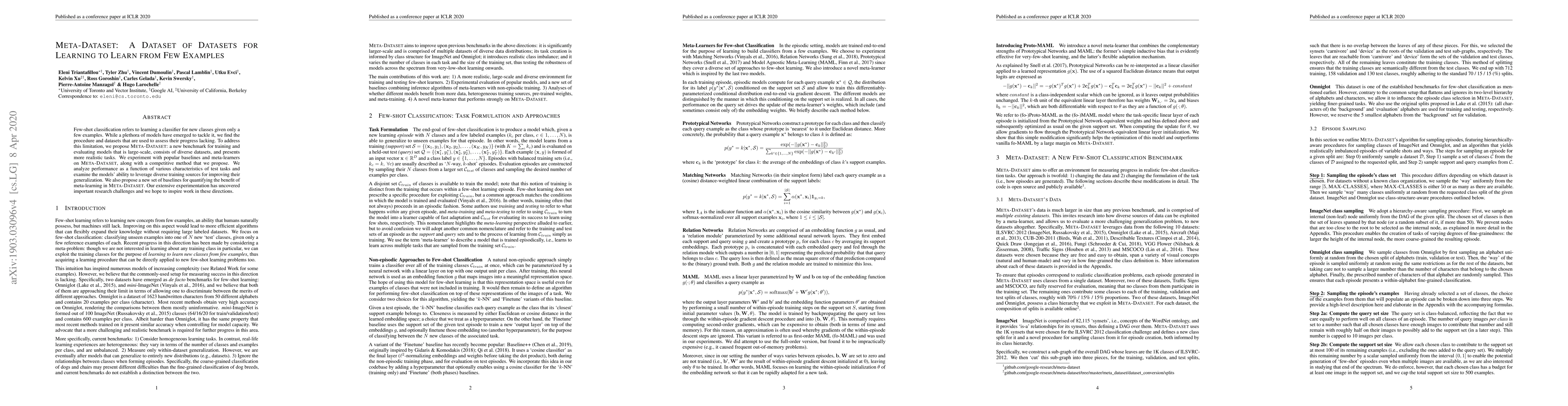 Few-shot classification refers to learning a classifier for new classes given only a few examples. While a plethora of models have emerged to tackle it, we find the procedure and datasets that are used to assess their progress lacking. To address this limitation, we propose Meta-Dataset: a new benchmark for training and evaluating models that is large-scale, consists of diverse datasets, and presents more realistic tasks. We experiment with popular baselines and meta-learners on Meta-Dataset, along with a competitive method that we propose. We analyze performance as a function of various characteristics of test tasks and examine the models' ability to leverage diverse training sources for improving their generalization. We also propose a new set of baselines for quantifying the benefit of meta-learning in Meta-Dataset. Our extensive experimentation has uncovered important research challenges and we hope to inspire work in these directions.