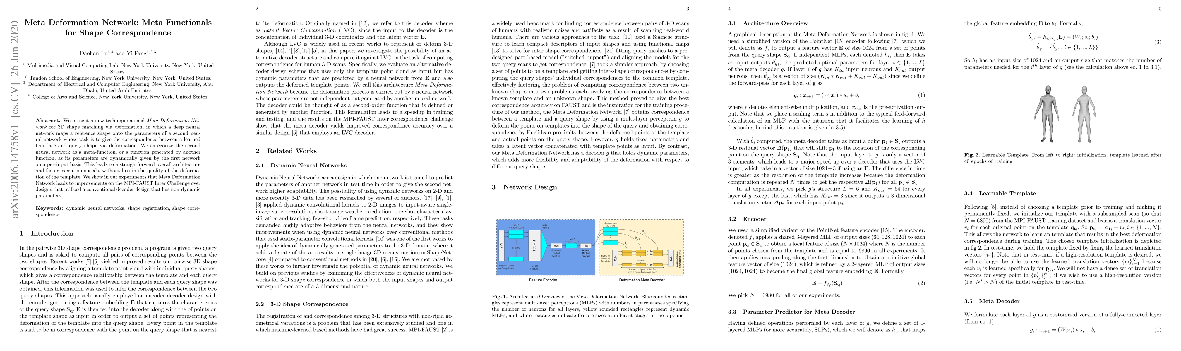 The Meta Deformation Network introduces a meta-function-based approach for 3D shape correspondence, dynamically generating decoder parameters for improved efficiency and performance.