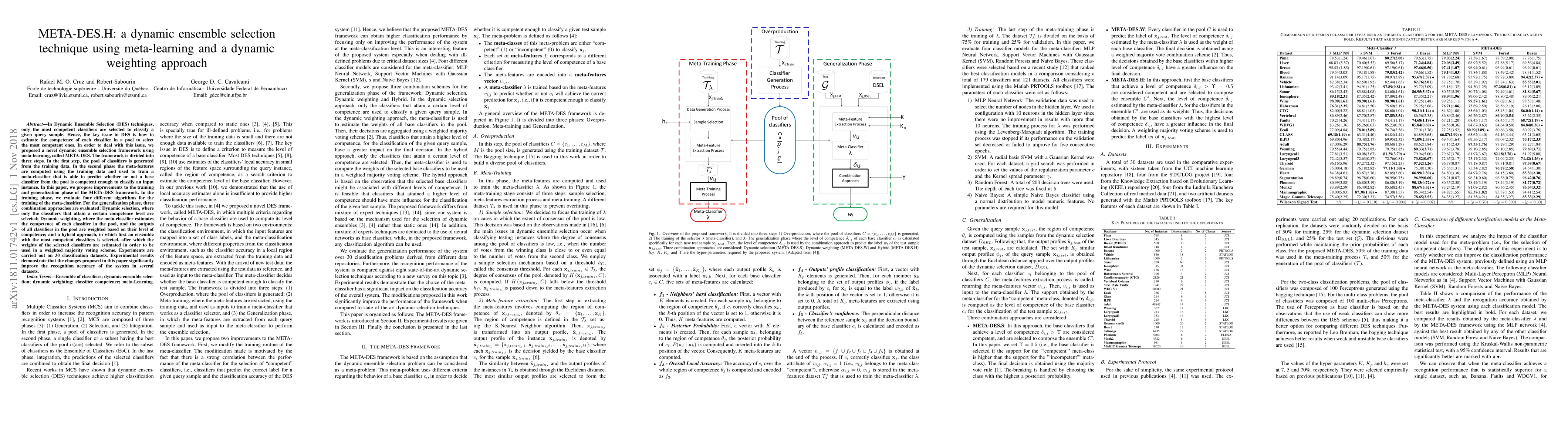 This paper introduces META-DES.H, a dynamic ensemble selection technique using meta-learning and a dynamic weighting approach to select the most competent classifiers for classification tasks. The framework improves training and generalization phases, showing significant accuracy improvements across 30 datasets.