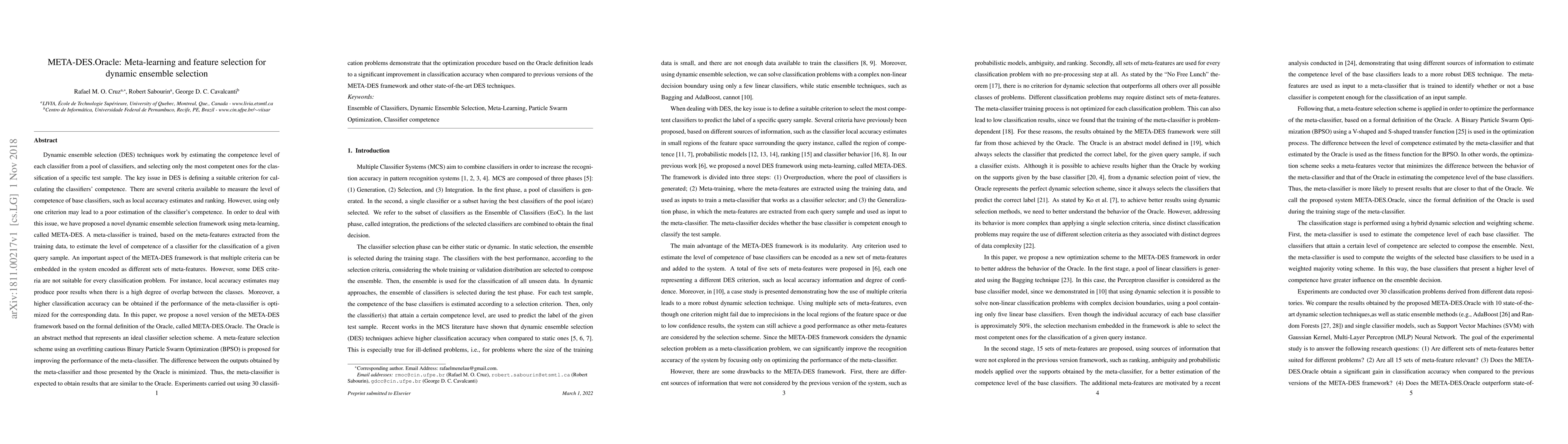 The paper introduces META-DES.Oracle, a novel dynamic ensemble selection framework that uses meta-learning and feature selection to optimize classifier competence. It employs an Oracle method to define an ideal classifier selection scheme and a Binary Particle Swarm Optimization for meta-feature selection, achieving significant improvements in classification accuracy over previous versions and other state-of-the-art techniques.
