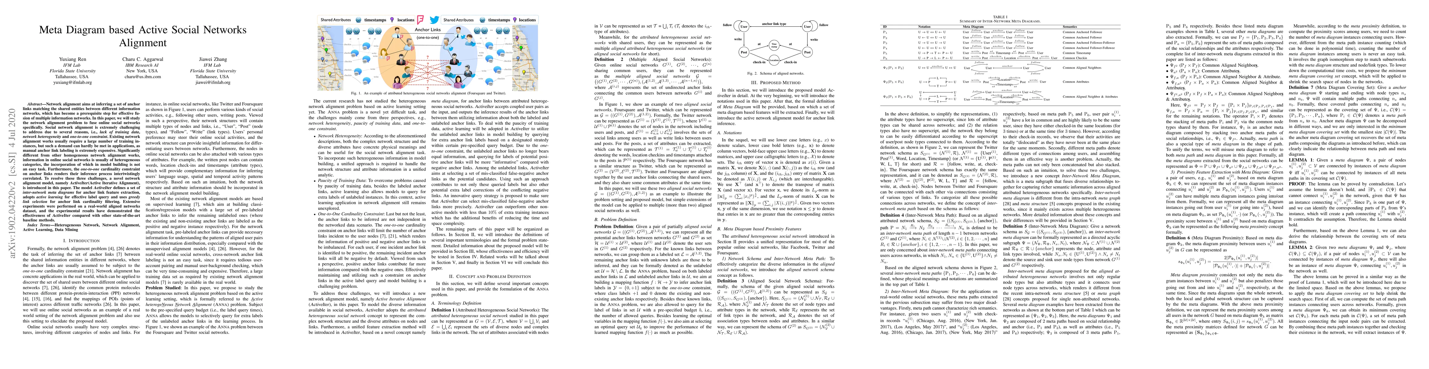 This paper introduces ActiveIter, a novel network alignment model for online social networks, addressing challenges like lack of training data, network heterogeneity, and one-to-one anchor link constraints. ActiveIter uses meta diagrams for feature extraction, active learning for efficient label querying, and greedy link selection for cardinality filtering, achieving superior performance in alignment tasks.