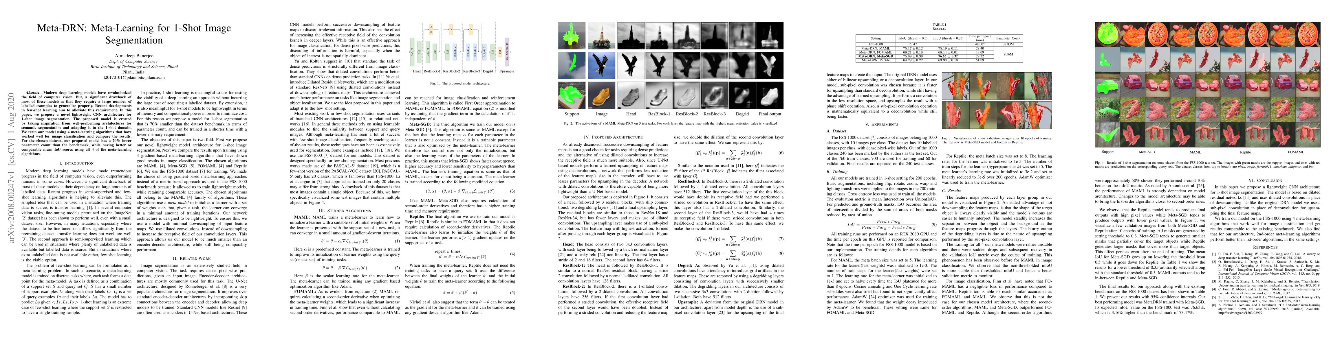 Researchers propose a lightweight CNN architecture for 1-shot image segmentation with a 70% lower parameter count than benchmarks while achieving comparable or better mean IoU scores.