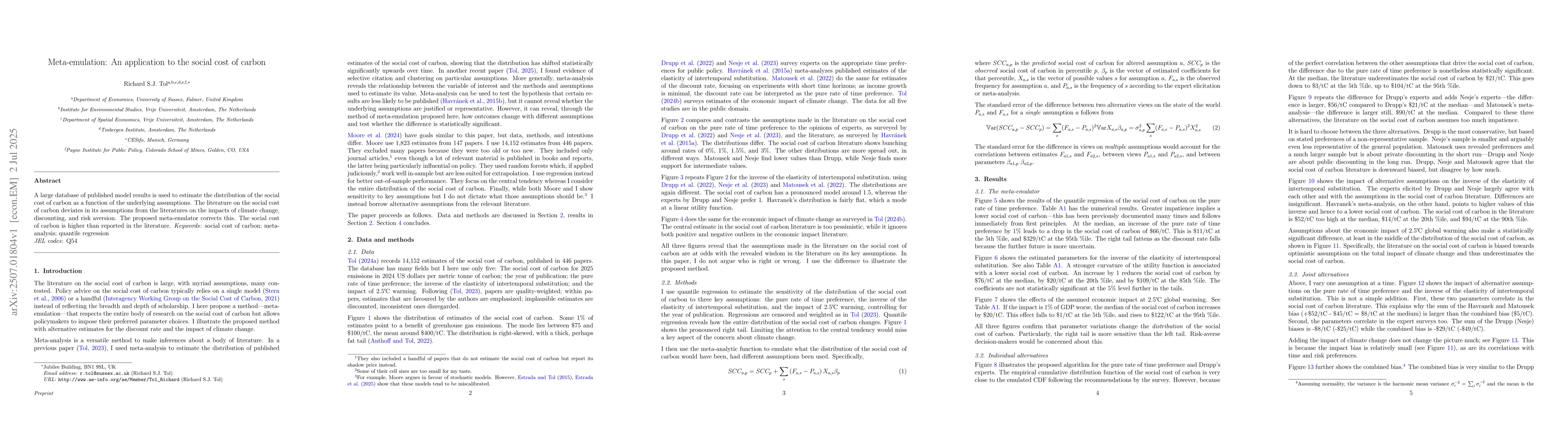 A large database of published model results is used to estimate the distribution of the social cost of carbon as a function of the underlying assumptions. The literature on the social cost of carbon deviates in its assumptions from the literatures on the impacts of climate change, discounting, and risk aversion. The proposed meta-emulator corrects this. The social cost of carbon is higher than reported in the literature.