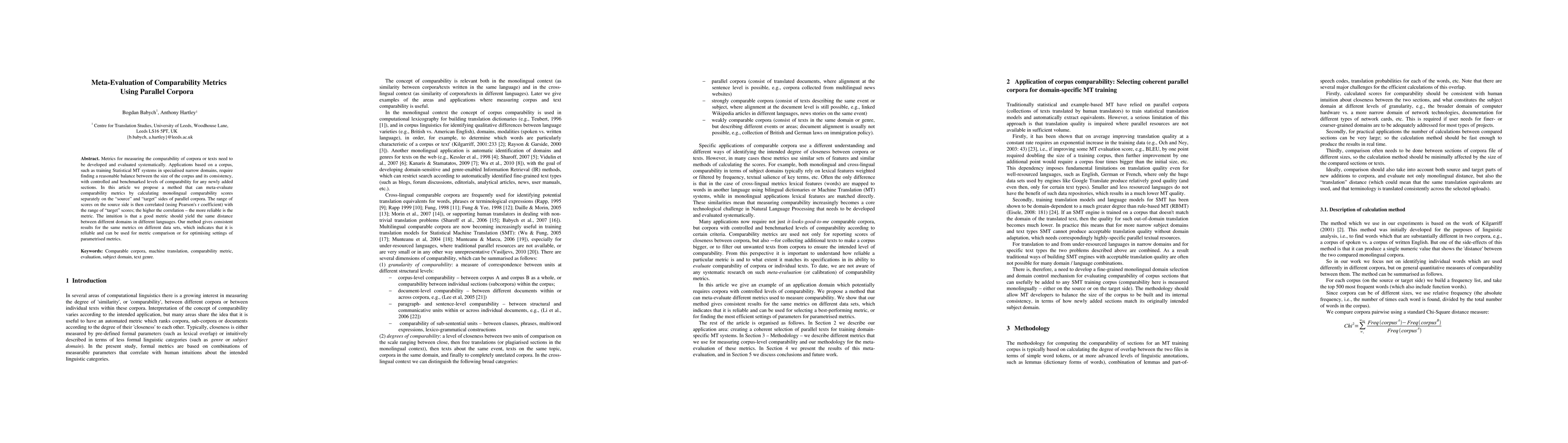 This paper proposes a method to meta-evaluate comparability metrics for parallel corpora by correlating monolingual comparability scores from the source and target sides using Pearson's r coefficient. The method aims to ensure consistency and reliability in assessing the comparability of corpora, which is essential for training specialized Statistical Machine Translation systems.