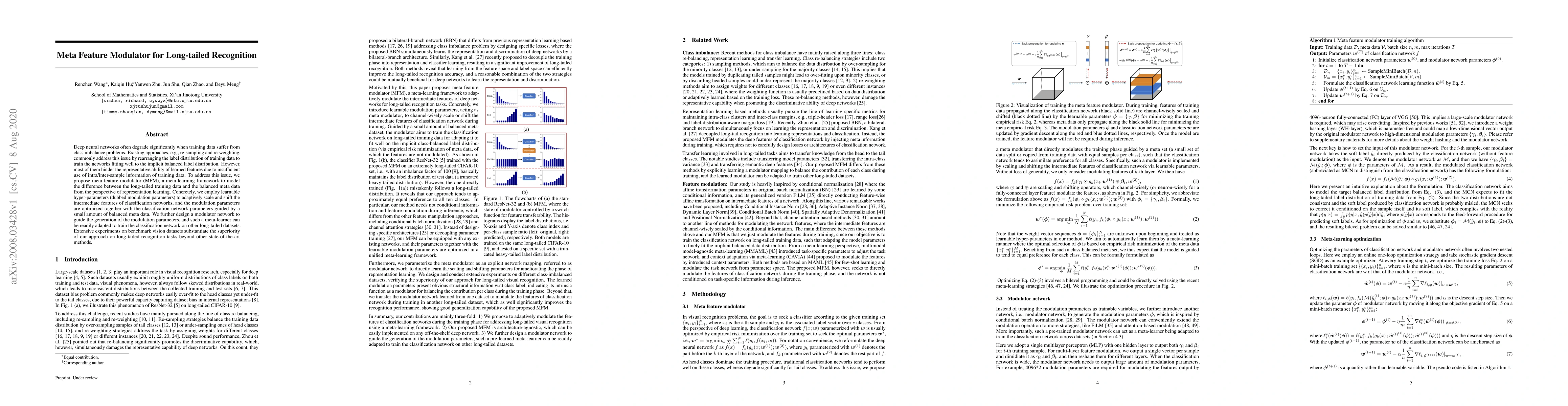 The paper proposes a meta feature modulator (MFM) framework to tackle long-tail recognition issues in deep neural networks by adaptively scaling and shifting intermediate features using modulation parameters optimized with balanced meta data. Experiments show MFM outperforms other methods on long-tailed datasets.