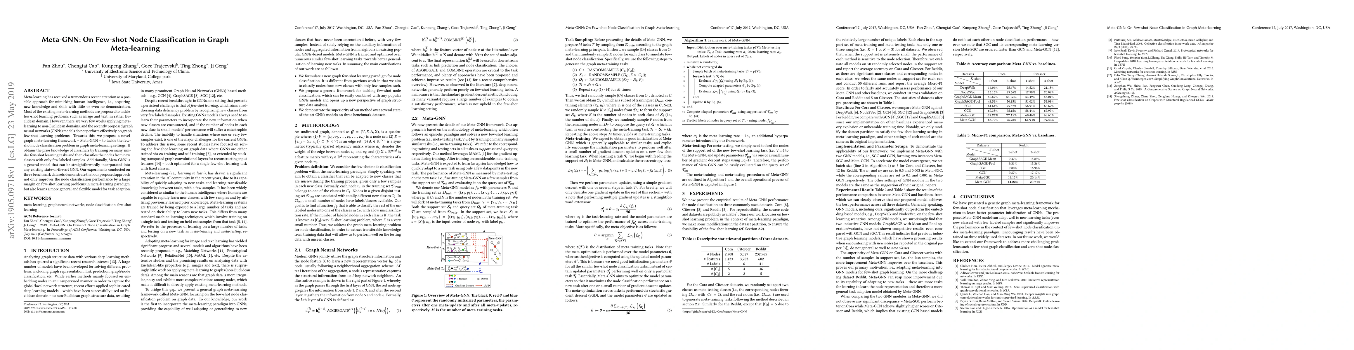 The paper proposes Meta-GNN, a novel graph meta-learning framework for few-shot node classification, which trains on many similar tasks to acquire prior knowledge and effectively classifies nodes from new classes with limited labeled samples. Experiments show significant improvements in few-shot learning performance and enhanced model flexibility.