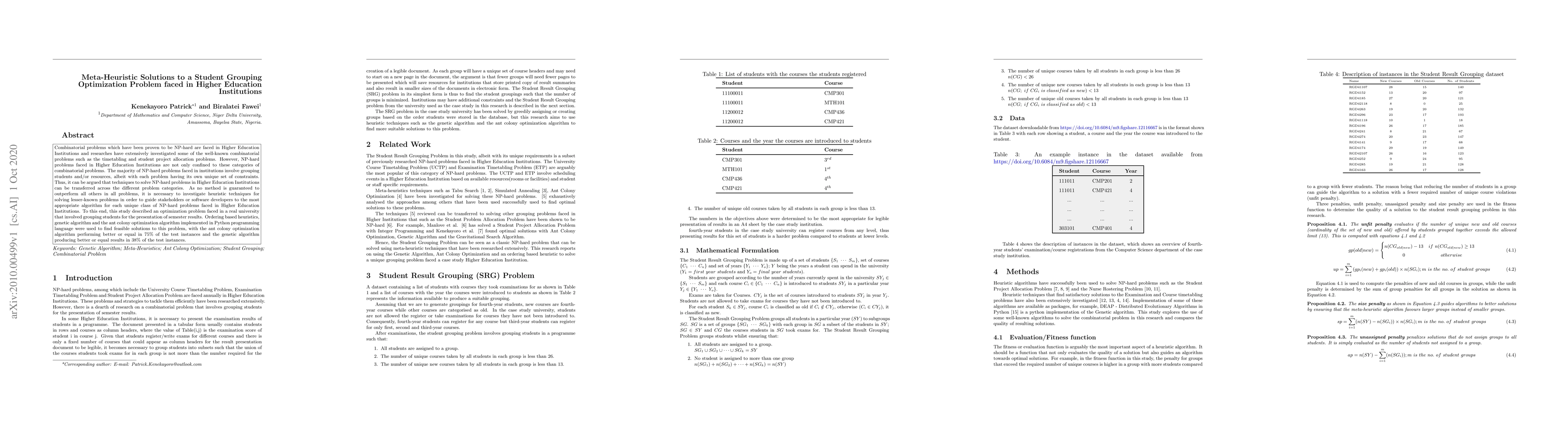 This paper explores meta-heuristic solutions for optimizing student grouping in higher education, focusing on a real university's semester result presentation problem. The study employs ordering-based heuristics, genetic algorithms, and ant colony optimization, finding that ant colony optimization outperforms the others in most test instances.