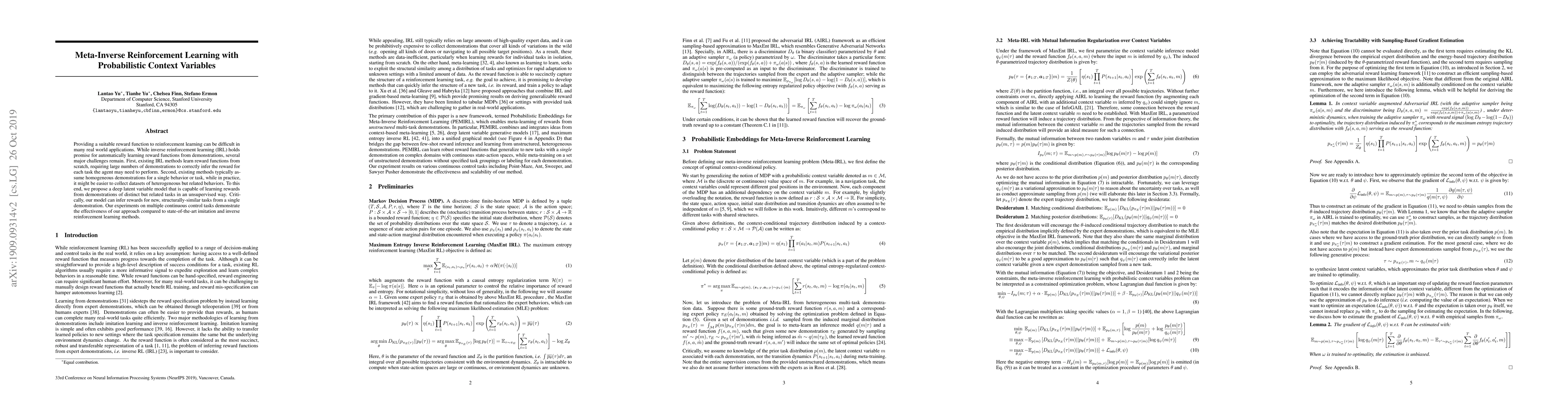 PEMIRL introduces a deep latent variable model capable of learning rewards from demonstrations of distinct but related tasks in an unsupervised manner, inferring rewards for new, structurally-similar tasks from a single demonstration.