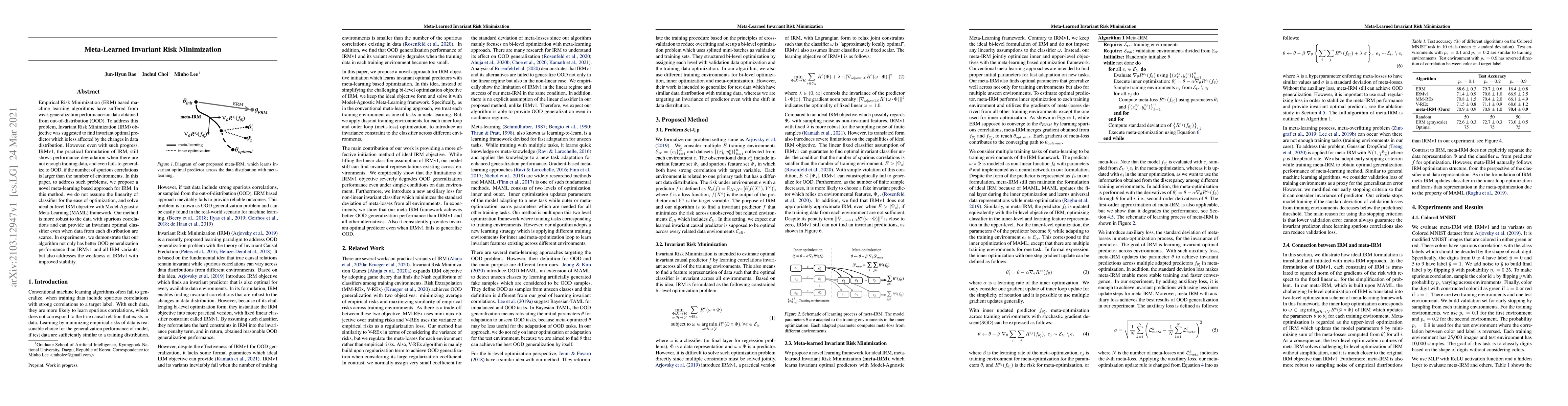 Empirical Risk Minimization (ERM) based machine learning algorithms have suffered from weak generalization performance on data obtained from out-of-distribution (OOD). To address this problem, Invariant Risk Minimization (IRM) objective was suggested to find invariant optimal predictor which is less affected by the changes in data distribution. However, even with such progress, IRMv1, the practical formulation of IRM, still shows performance degradation when there are not enough training data, and even fails to generalize to OOD, if the number of spurious correlations is larger than the number of environments. In this paper, to address such problems, we propose a novel meta-learning based approach for IRM. In this method, we do not assume the linearity of classifier for the ease of optimization, and solve ideal bi-level IRM objective with Model-Agnostic Meta-Learning (MAML) framework. Our method is more robust to the data with spurious correlations and can provide an invariant optimal classifier even when data from each distribution are scarce. In experiments, we demonstrate that our algorithm not only has better OOD generalization performance than IRMv1 and all IRM variants, but also addresses the weakness of IRMv1 with improved stability.