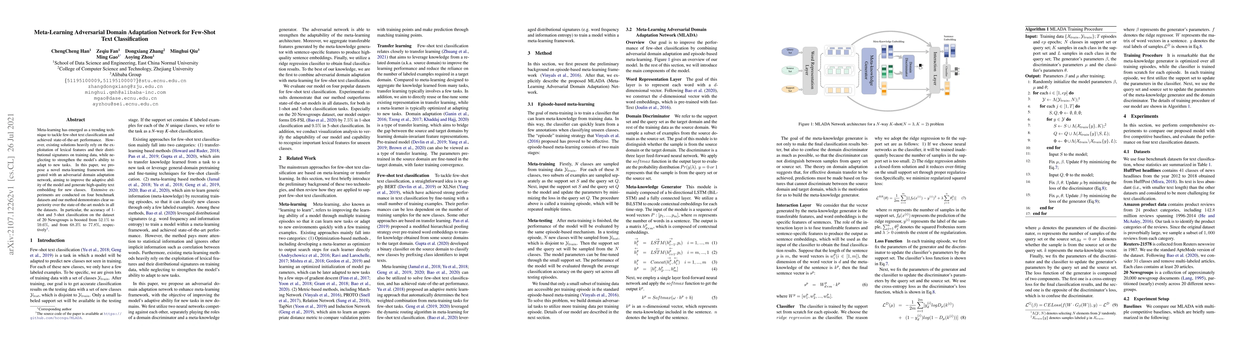 This paper proposes a meta-learning framework with an adversarial domain adaptation network to enhance few-shot text classification, showing improved adaptability and superior performance over existing methods on four benchmark datasets, particularly boosting accuracy on the 20 Newsgroups dataset.