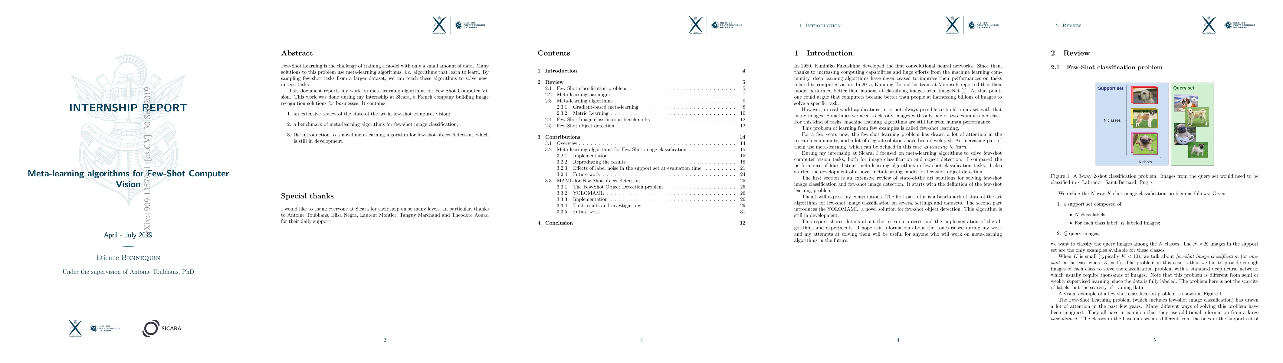 Few-Shot Learning is the challenge of training a model with only a small amount of data. Many solutions to this problem use meta-learning algorithms, i.e. algorithms that learn to learn. By sampling few-shot tasks from a larger dataset, we can teach these algorithms to solve new, unseen tasks. This document reports my work on meta-learning algorithms for Few-Shot Computer Vision. This work was done during my internship at Sicara, a French company building image recognition solutions for businesses. It contains: 1. an extensive review of the state-of-the-art in few-shot computer vision; 2. a benchmark of meta-learning algorithms for few-shot image classification; 3. the introduction to a novel meta-learning algorithm for few-shot object detection, which is still in development.