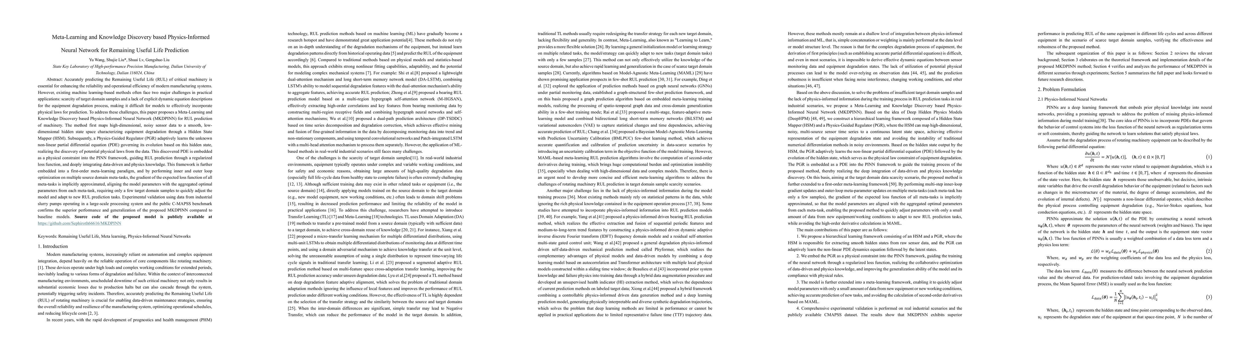 This paper proposes a Meta-Learning and Knowledge Discovery-based Physics-Informed Neural Network (MKDPINN) to predict the remaining useful life (RUL) of machinery, addressing challenges of scarce data and unclear degradation dynamics. The method combines a Hidden State Mapper and a Physics-Guided Regulator, leveraging meta-learning for few-shot adaptation, and demonstrates superior performance over baselines in industrial and benchmark datasets.