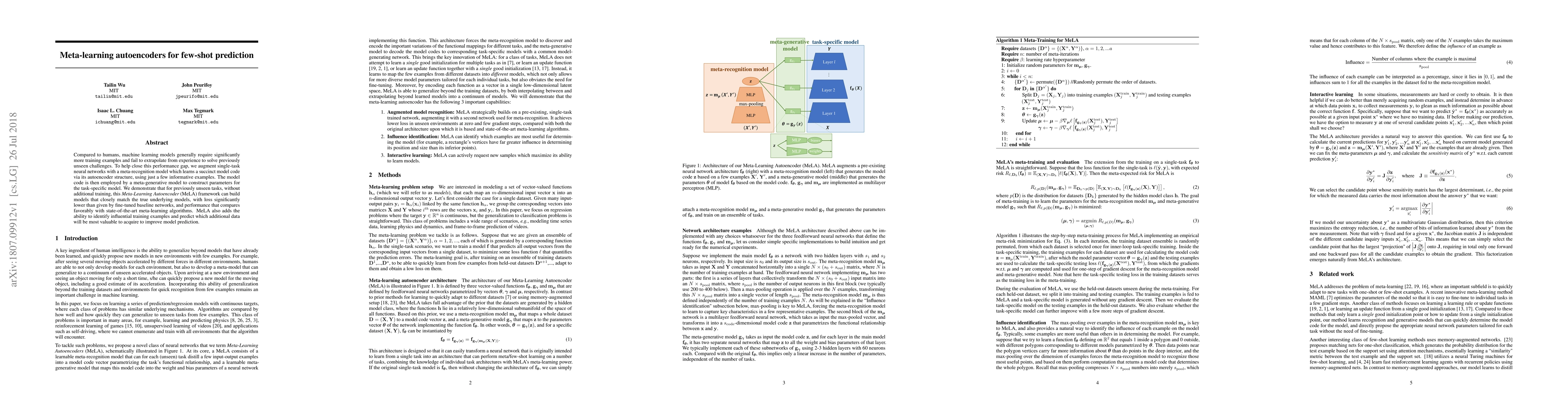 Compared to humans, machine learning models generally require significantly more training examples and fail to extrapolate from experience to solve previously unseen challenges. To help close this performance gap, we augment single-task neural networks with a meta-recognition model which learns a succinct model code via its autoencoder structure, using just a few informative examples. The model code is then employed by a meta-generative model to construct parameters for the task-specific model. We demonstrate that for previously unseen tasks, without additional training, this Meta-Learning Autoencoder (MeLA) framework can build models that closely match the true underlying models, with loss significantly lower than given by fine-tuned baseline networks, and performance that compares favorably with state-of-the-art meta-learning algorithms. MeLA also adds the ability to identify influential training examples and predict which additional data will be most valuable to acquire to improve model prediction.
