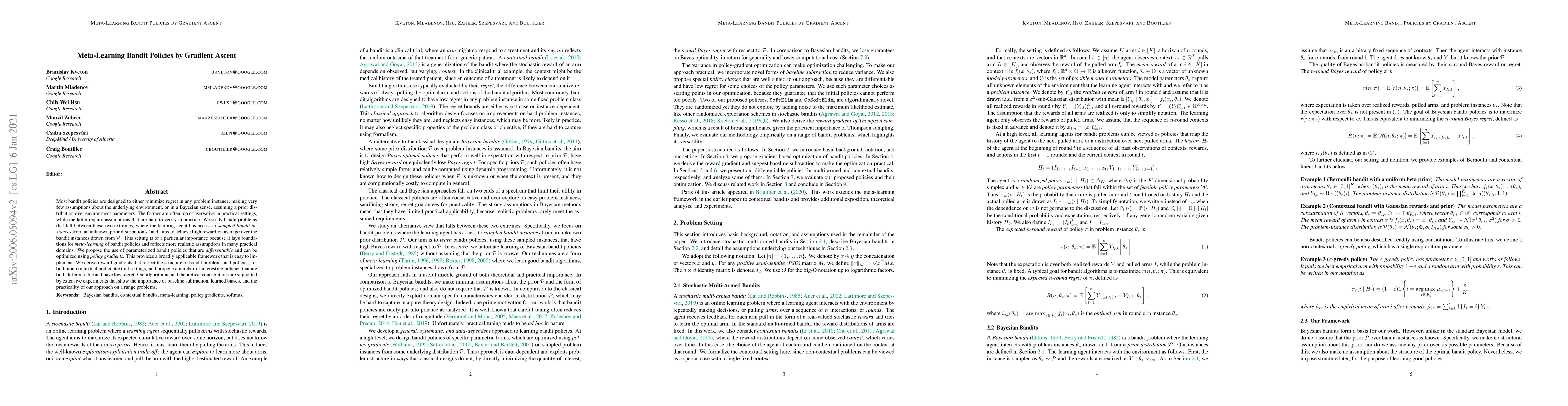 Most bandit policies are designed to either minimize regret in any problem instance, making very few assumptions about the underlying environment, or in a Bayesian sense, assuming a prior distribution over environment parameters. The former are often too conservative in practical settings, while the latter require assumptions that are hard to verify in practice. We study bandit problems that fall between these two extremes, where the learning agent has access to sampled bandit instances from an unknown prior distribution $\mathcal{P}$ and aims to achieve high reward on average over the bandit instances drawn from $\mathcal{P}$. This setting is of a particular importance because it lays foundations for meta-learning of bandit policies and reflects more realistic assumptions in many practical domains. We propose the use of parameterized bandit policies that are differentiable and can be optimized using policy gradients. This provides a broadly applicable framework that is easy to implement. We derive reward gradients that reflect the structure of bandit problems and policies, for both non-contextual and contextual settings, and propose a number of interesting policies that are both differentiable and have low regret. Our algorithmic and theoretical contributions are supported by extensive experiments that show the importance of baseline subtraction, learned biases, and the practicality of our approach on a range problems.