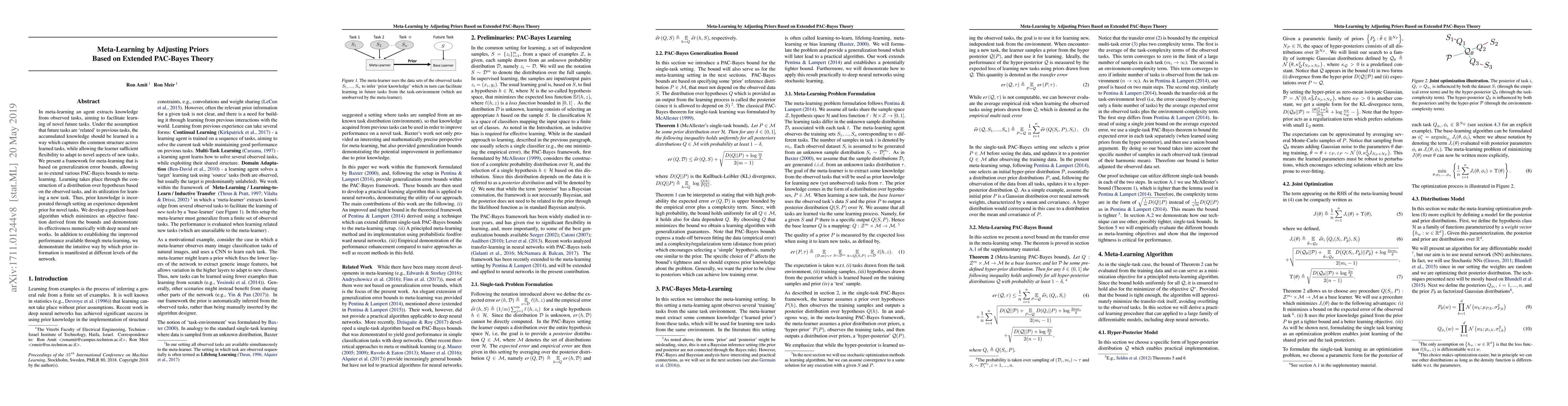 In meta-learning an agent extracts knowledge from observed tasks, aiming to facilitate learning of novel future tasks. Under the assumption that future tasks are 'related' to previous tasks, the accumulated knowledge should be learned in a way which captures the common structure across learned tasks, while allowing the learner sufficient flexibility to adapt to novel aspects of new tasks. We present a framework for meta-learning that is based on generalization error bounds, allowing us to extend various PAC-Bayes bounds to meta-learning. Learning takes place through the construction of a distribution over hypotheses based on the observed tasks, and its utilization for learning a new task. Thus, prior knowledge is incorporated through setting an experience-dependent prior for novel tasks. We develop a gradient-based algorithm which minimizes an objective function derived from the bounds and demonstrate its effectiveness numerically with deep neural networks. In addition to establishing the improved performance available through meta-learning, we demonstrate the intuitive way by which prior information is manifested at different levels of the network.