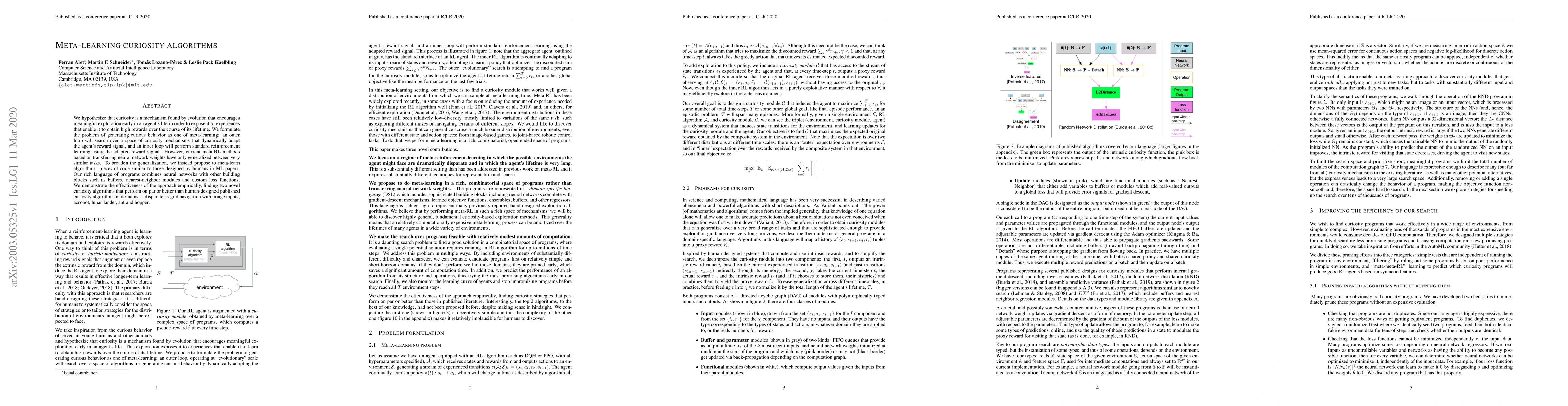 This paper proposes meta-learning curiosity algorithms that dynamically adapt reward signals to encourage exploration, using a meta-learning framework that generalizes beyond similar tasks by learning algorithms rather than neural network weights. The approach combines neural networks with various program components, achieving competitive performance in diverse reinforcement learning domains.