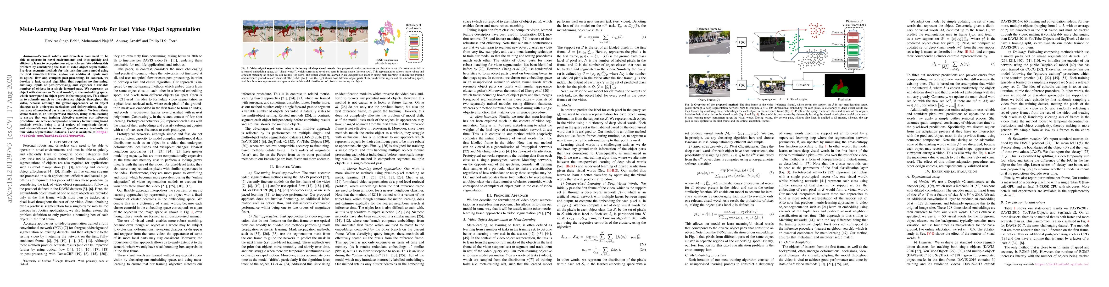 This paper proposes a fast meta-learning algorithm for video object segmentation that segments objects without finetuning, additional inputs, or post-processing. It uses unsupervised meta-learning to create "visual words" representing object parts, achieving comparable accuracy to finetuning-based methods but at a significantly faster speed.