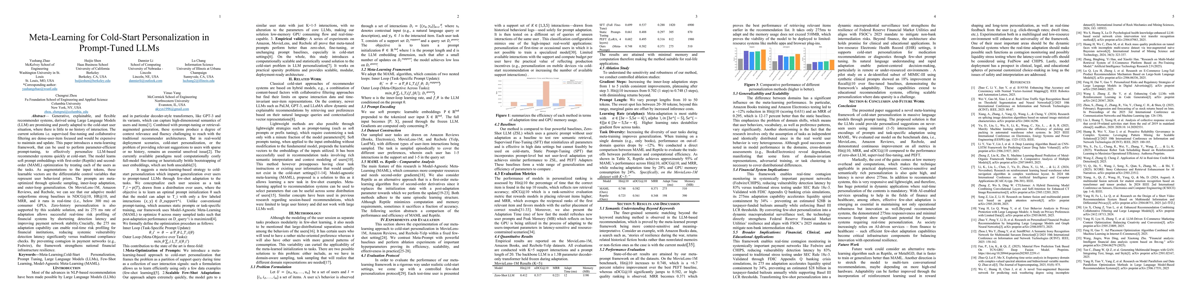 Generative, explainable, and flexible recommender systems, derived using Large Language Models (LLM) are promising and poorly adapted to the cold-start user situation, where there is little to no history of interaction. The current solutions i.e. supervised fine-tuning and collaborative filtering are dense-user-item focused and would be expensive to maintain and update. This paper introduces a meta-learning framework, that can be used to perform parameter-efficient prompt-tuning, to effectively personalize LLM-based recommender systems quickly at cold-start. The model learns soft prompt embeddings with first-order (Reptile) and second-order (MAML) optimization by treating each of the users as the tasks. As augmentations to the input tokens, these learnable vectors are the differentiable control variables that represent user behavioral priors. The prompts are meta-optimized through episodic sampling, inner-loop adaptation, and outer-loop generalization. On MovieLens-1M, Amazon Reviews, and Recbole, we can see that our adaptive model outperforms strong baselines in NDCG@10, HR@10, and MRR, and it runs in real-time (i.e., below 300 ms) on consumer GPUs. Zero-history personalization is also supported by this scalable solution, and its 275 ms rate of adaptation allows successful real-time risk profiling of financial systems by shortening detection latency and improving payment network stability. Crucially, the 275 ms adaptation capability can enable real-time risk profiling for financial institutions, reducing systemic vulnerability detection latency significantly versus traditional compliance checks. By preventing contagion in payment networks (e.g., Fedwire), the framework strengthens national financial infrastructure resilience.