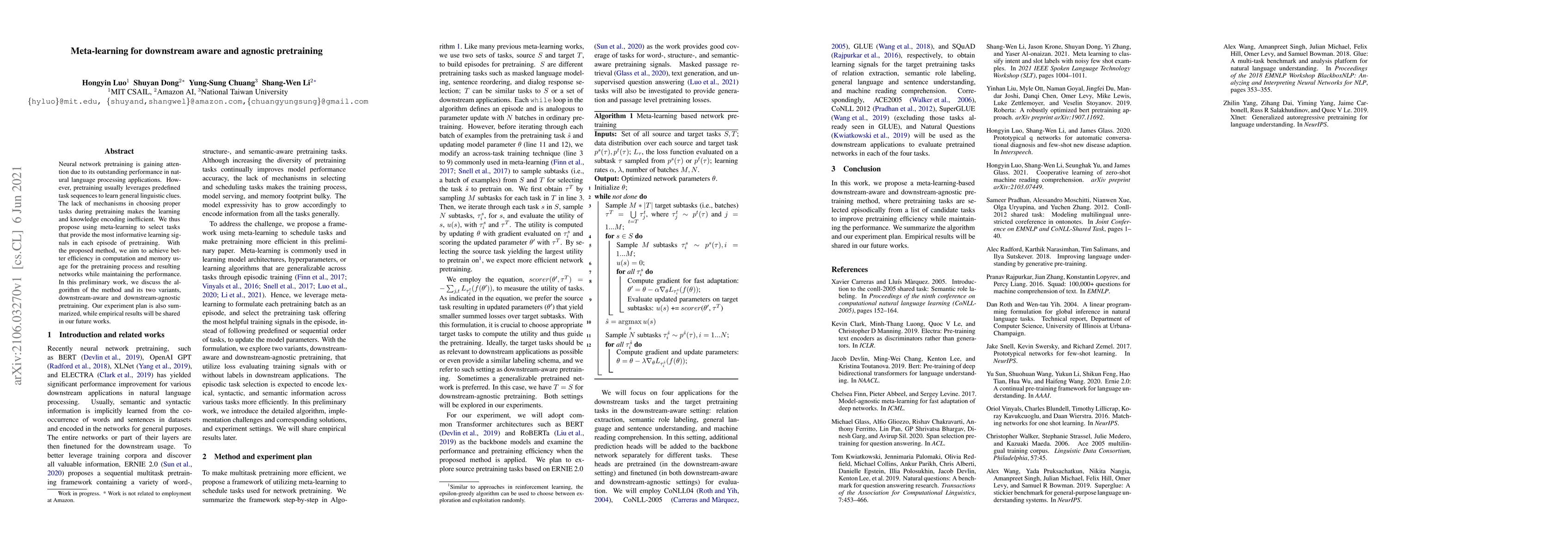 Neural network pretraining is gaining attention due to its outstanding performance in natural language processing applications. However, pretraining usually leverages predefined task sequences to learn general linguistic clues. The lack of mechanisms in choosing proper tasks during pretraining makes the learning and knowledge encoding inefficient. We thus propose using meta-learning to select tasks that provide the most informative learning signals in each episode of pretraining. With the proposed method, we aim to achieve better efficiency in computation and memory usage for the pretraining process and resulting networks while maintaining the performance. In this preliminary work, we discuss the algorithm of the method and its two variants, downstream-aware and downstream-agnostic pretraining. Our experiment plan is also summarized, while empirical results will be shared in our future works.