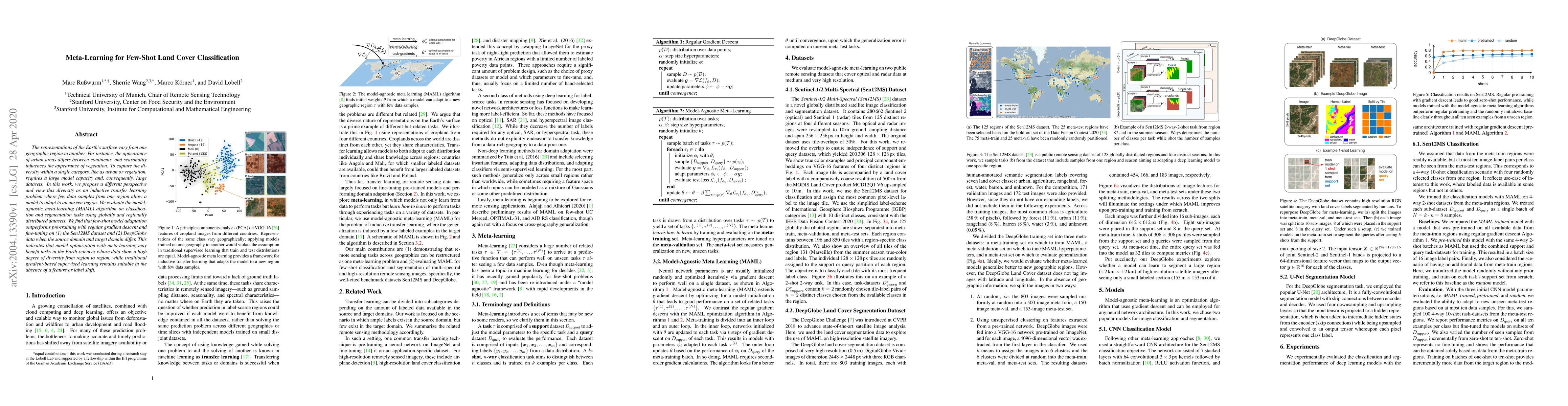 This paper proposes meta-learning for few-shot land cover classification, demonstrating that model-agnostic meta-learning (MAML) can adapt a model to new regions with limited data samples. The approach outperforms traditional gradient-based methods in adapting to diverse geographic regions, suggesting its potential for Earth science tasks with high regional data variability.