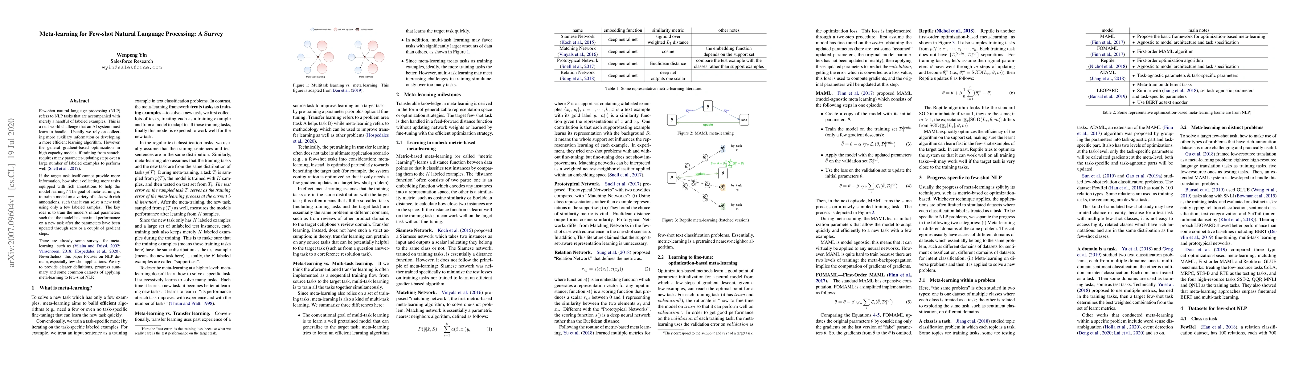 Few-shot natural language processing (NLP) refers to NLP tasks that are accompanied with merely a handful of labeled examples. This is a real-world challenge that an AI system must learn to handle. Usually we rely on collecting more auxiliary information or developing a more efficient learning algorithm. However, the general gradient-based optimization in high capacity models, if training from scratch, requires many parameter-updating steps over a large number of labeled examples to perform well (Snell et al., 2017). If the target task itself cannot provide more information, how about collecting more tasks equipped with rich annotations to help the model learning? The goal of meta-learning is to train a model on a variety of tasks with rich annotations, such that it can solve a new task using only a few labeled samples. The key idea is to train the model's initial parameters such that the model has maximal performance on a new task after the parameters have been updated through zero or a couple of gradient steps. There are already some surveys for meta-learning, such as (Vilalta and Drissi, 2002; Vanschoren, 2018; Hospedales et al., 2020). Nevertheless, this paper focuses on NLP domain, especially few-shot applications. We try to provide clearer definitions, progress summary and some common datasets of applying meta-learning to few-shot NLP.