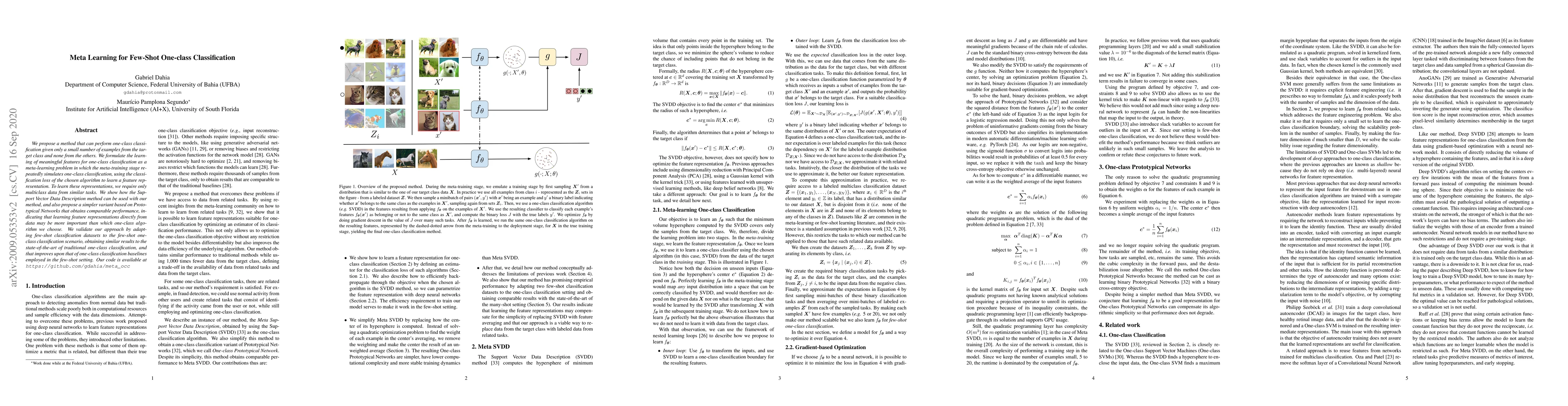 This paper proposes a meta-learning approach for few-shot one-class classification, utilizing both Support Vector Data Description and Prototypical Networks to learn meaningful features from a small number of target class examples. The method achieves competitive performance with state-of-the-art traditional one-class classification techniques.