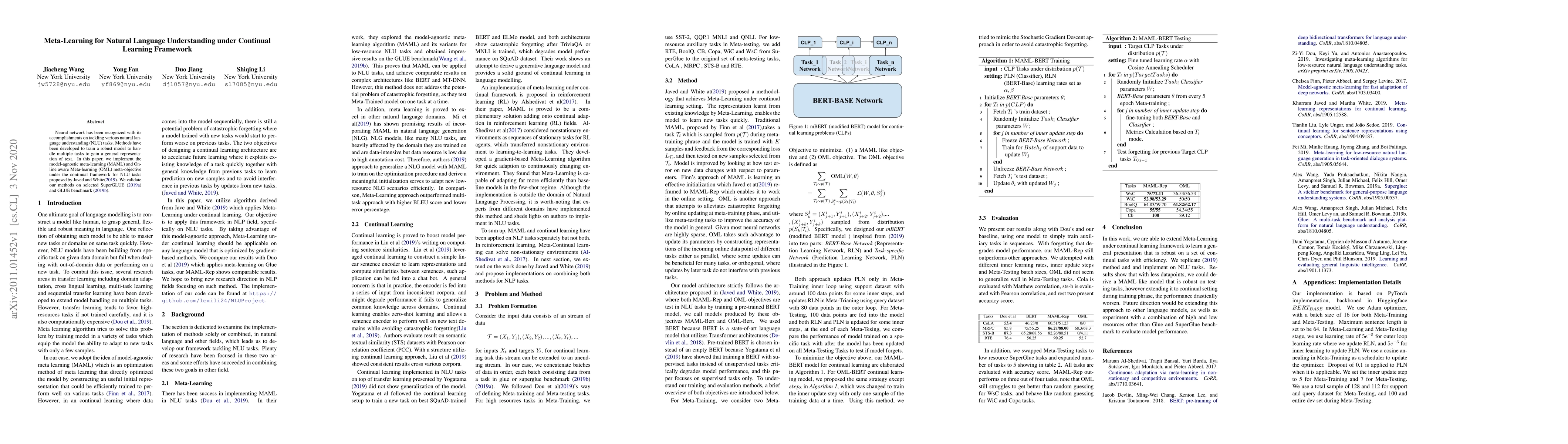 Neural network has been recognized with its accomplishments on tackling various natural language understanding (NLU) tasks. Methods have been developed to train a robust model to handle multiple tasks to gain a general representation of text. In this paper, we implement the model-agnostic meta-learning (MAML) and Online aware Meta-learning (OML) meta-objective under the continual framework for NLU tasks. We validate our methods on selected SuperGLUE and GLUE benchmark.