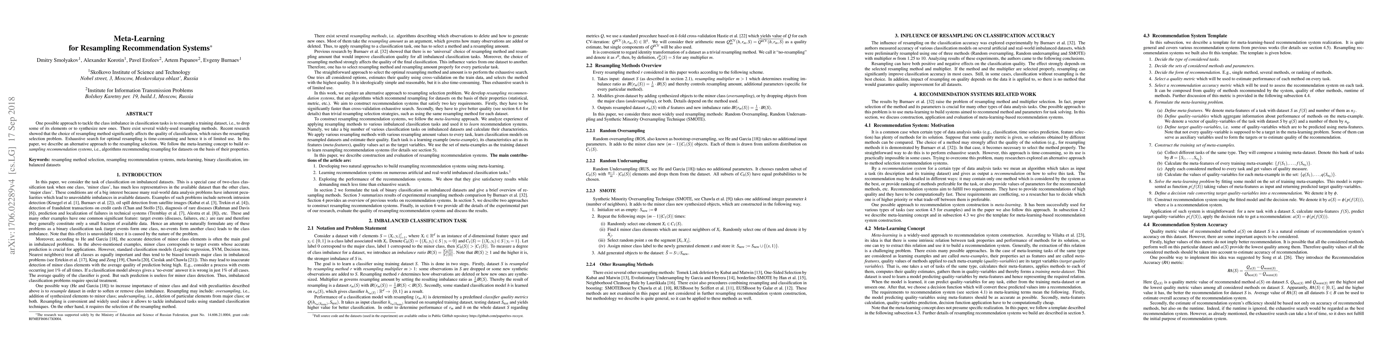 One possible approach to tackle the class imbalance in classification tasks is to resample a training dataset, i.e., to drop some of its elements or to synthesize new ones. There exist several widely-used resampling methods. Recent research showed that the choice of resampling method significantly affects the quality of classification, which raises resampling selection problem. Exhaustive search for optimal resampling is time-consuming and hence it is of limited use. In this paper, we describe an alternative approach to the resampling selection. We follow the meta-learning concept to build resampling recommendation systems, i.e., algorithms recommending resampling for datasets on the basis of their properties.