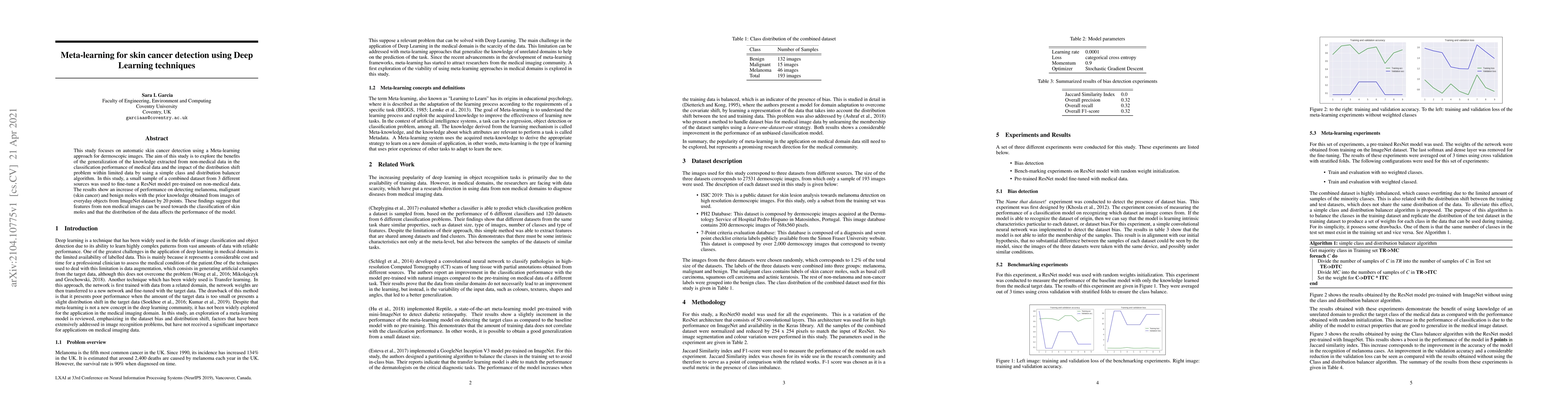 This study focuses on automatic skin cancer detection using a Meta-learning approach for dermoscopic images. The aim of this study is to explore the benefits of the generalization of the knowledge extracted from non-medical data in the classification performance of medical data and the impact of the distribution shift problem within limited data by using a simple class and distribution balancer algorithm. In this study, a small sample of a combined dataset from 3 different sources was used to fine-tune a ResNet model pre-trained on non-medical data. The results show an increase in performance on detecting melanoma, malignant (skin cancer), and benign moles with the prior knowledge obtained from images of everyday objects from the ImageNet dataset by 20 points. These findings suggest that features from non-medical images can be used towards the classification of skin moles and that the distribution of the data affects the performance of the model.