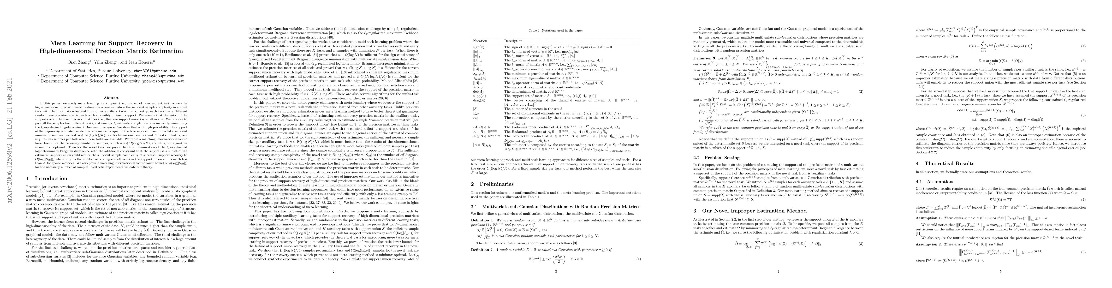 This paper explores meta learning techniques to improve support recovery in high-dimensional precision matrix estimation by leveraging information from auxiliary tasks. The proposed method pools samples across tasks to reduce sample complexity, achieving optimal sample requirements and demonstrating significant reductions in necessary samples for support recovery.