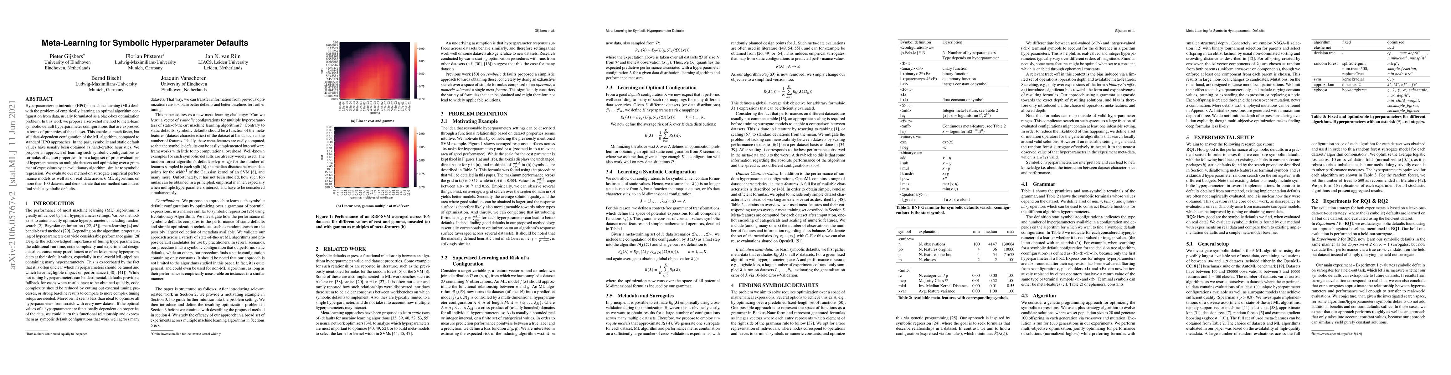 Hyperparameter optimization in machine learning (ML) deals with the problem of empirically learning an optimal algorithm configuration from data, usually formulated as a black-box optimization problem. In this work, we propose a zero-shot method to meta-learn symbolic default hyperparameter configurations that are expressed in terms of the properties of the dataset. This enables a much faster, but still data-dependent, configuration of the ML algorithm, compared to standard hyperparameter optimization approaches. In the past, symbolic and static default values have usually been obtained as hand-crafted heuristics. We propose an approach of learning such symbolic configurations as formulas of dataset properties from a large set of prior evaluations on multiple datasets by optimizing over a grammar of expressions using an evolutionary algorithm. We evaluate our method on surrogate empirical performance models as well as on real data across 6 ML algorithms on more than 100 datasets and demonstrate that our method indeed finds viable symbolic defaults.