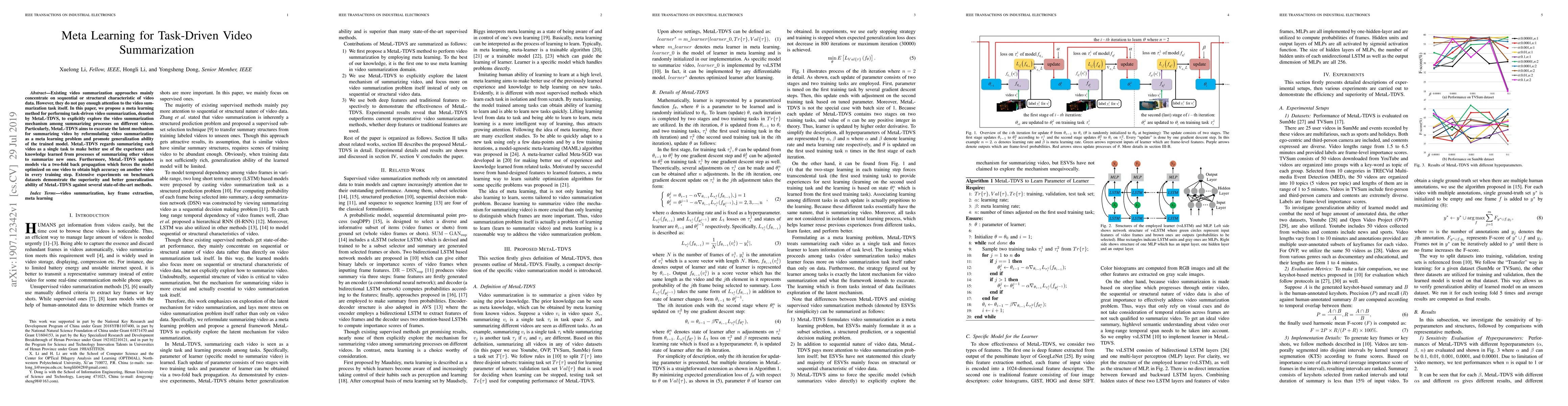 This paper proposes MetaL-TDVS, a meta learning method for task-driven video summarization that reformulates summarization as a meta learning problem, enhancing generalization by leveraging knowledge from previous summarization tasks. Experiments show MetaL-TDVS outperforms state-of-the-art methods in summarization accuracy and generalization.