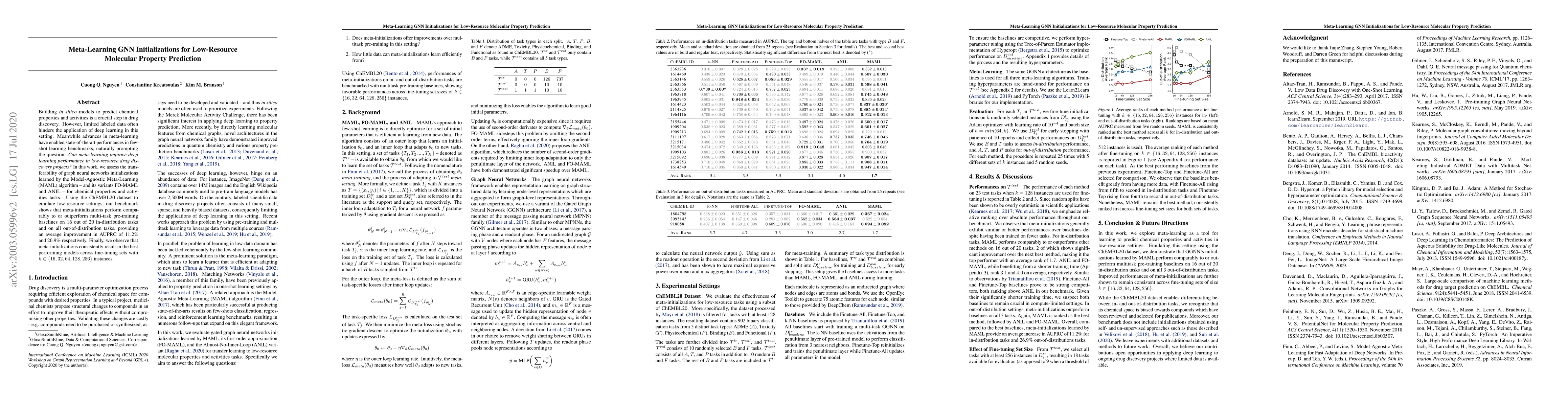 This paper explores the use of meta-learning to initialize graph neural networks for predicting chemical properties in low-resource settings, demonstrating that meta-initializations learned via MAML and its variants significantly outperform multi-task pre-training baselines, especially in out-of-distribution tasks.