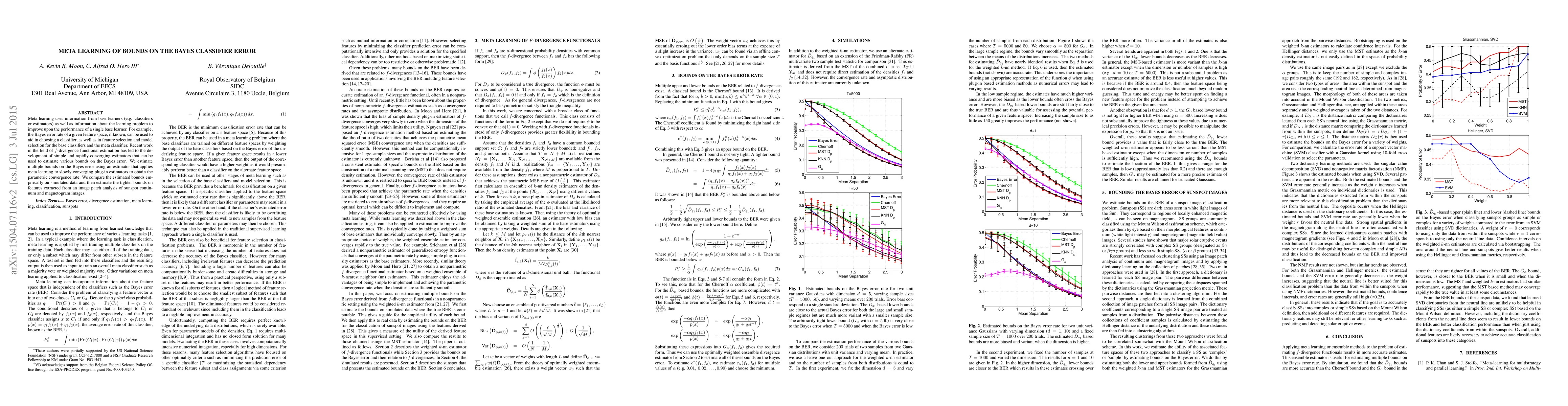 This paper explores meta learning techniques to improve the estimation of bounds on the Bayes classifier error rate, leveraging f-divergence functional estimation. The proposed method combines meta learning with plug-in estimators to achieve faster convergence and tighter bounds, which are empirically validated on simulated data and applied to sunspot image analysis.