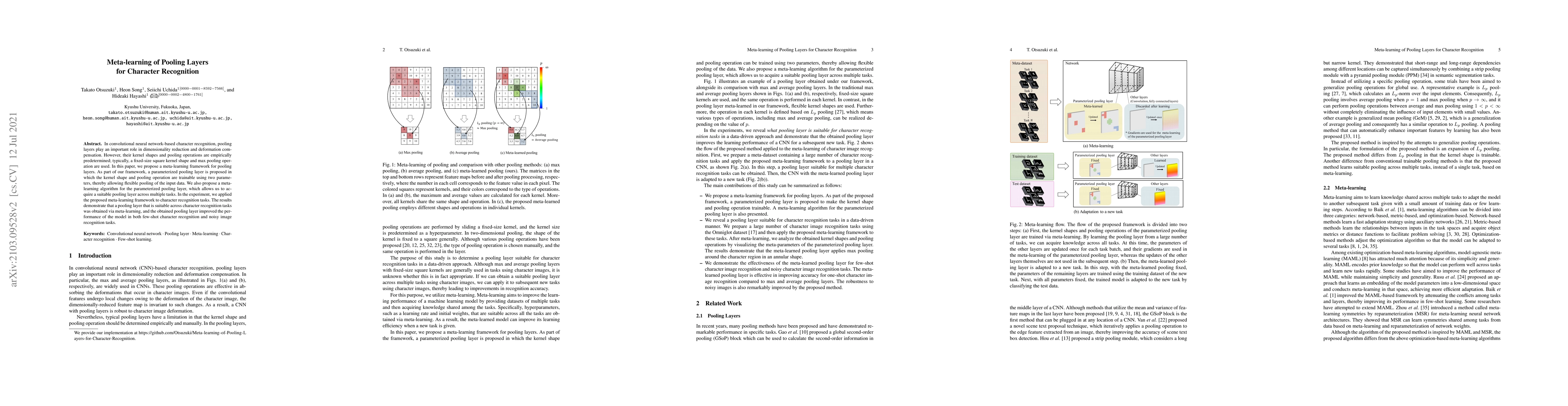 This paper proposes a meta-learning framework for adaptive pooling layers in convolutional neural networks, allowing trainable kernel shapes and pooling operations to enhance character recognition. Experimental results show improved performance in few-shot and noisy image recognition tasks.
