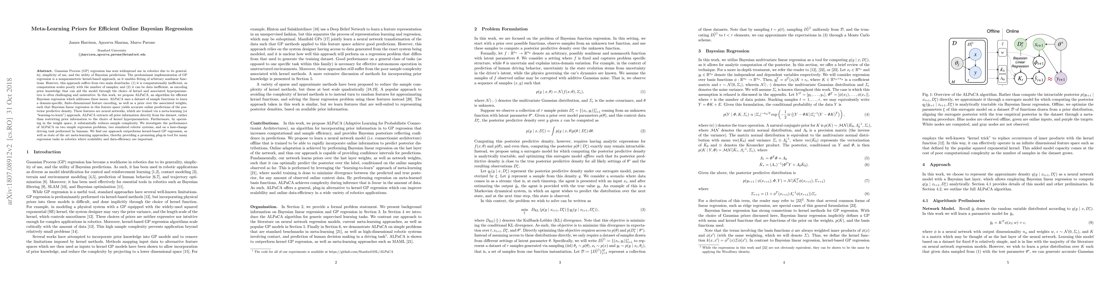 This paper proposes ALPaCA, a meta-learning algorithm for efficient online Bayesian regression, which learns a neural network feature encoding from a dataset to improve computational efficiency and data-efficiency over traditional Gaussian Process regression. ALPaCA outperforms kernel-based GP regression and state-of-the-art meta-learning methods on various regression tasks, especially in robotics.
