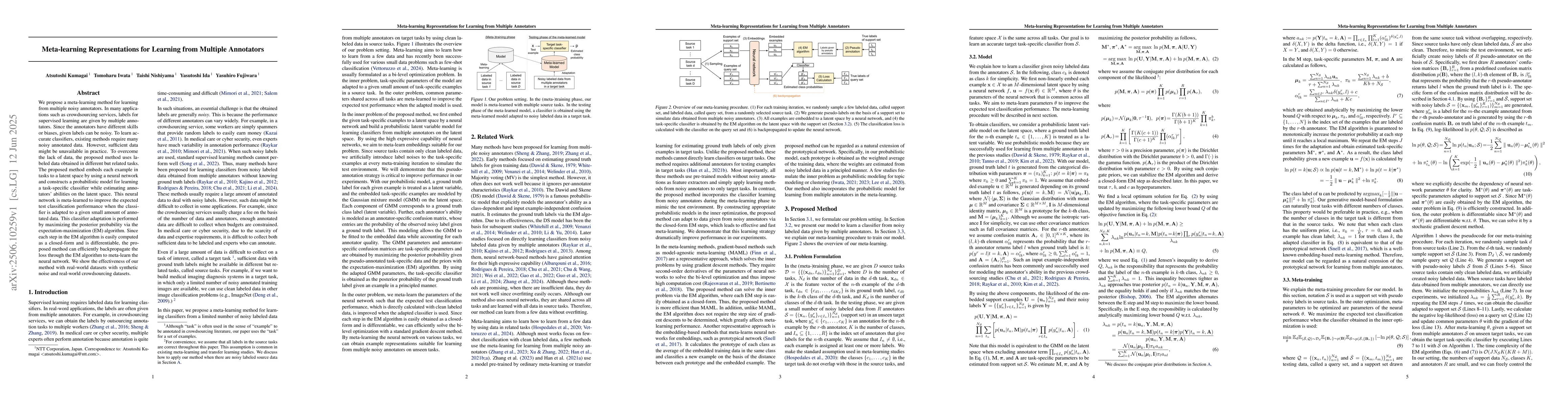 A new method for learning from multiple noisy annotators is proposed, using labeled data from related tasks to improve classifier accuracy on small amounts of annotated data. The method uses a meta-learning approach to efficiently backpropagate the loss through the Expectation-Maximization algorithm.