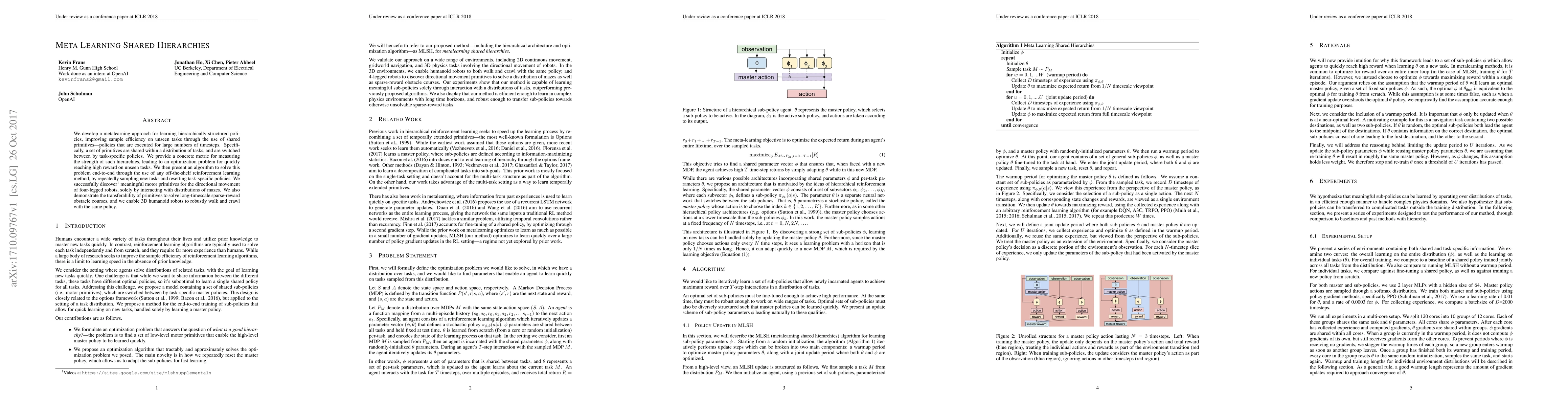 We develop a metalearning approach for learning hierarchically structured policies, improving sample efficiency on unseen tasks through the use of shared primitives---policies that are executed for large numbers of timesteps. Specifically, a set of primitives are shared within a distribution of tasks, and are switched between by task-specific policies. We provide a concrete metric for measuring the strength of such hierarchies, leading to an optimization problem for quickly reaching high reward on unseen tasks. We then present an algorithm to solve this problem end-to-end through the use of any off-the-shelf reinforcement learning method, by repeatedly sampling new tasks and resetting task-specific policies. We successfully discover meaningful motor primitives for the directional movement of four-legged robots, solely by interacting with distributions of mazes. We also demonstrate the transferability of primitives to solve long-timescale sparse-reward obstacle courses, and we enable 3D humanoid robots to robustly walk and crawl with the same policy.