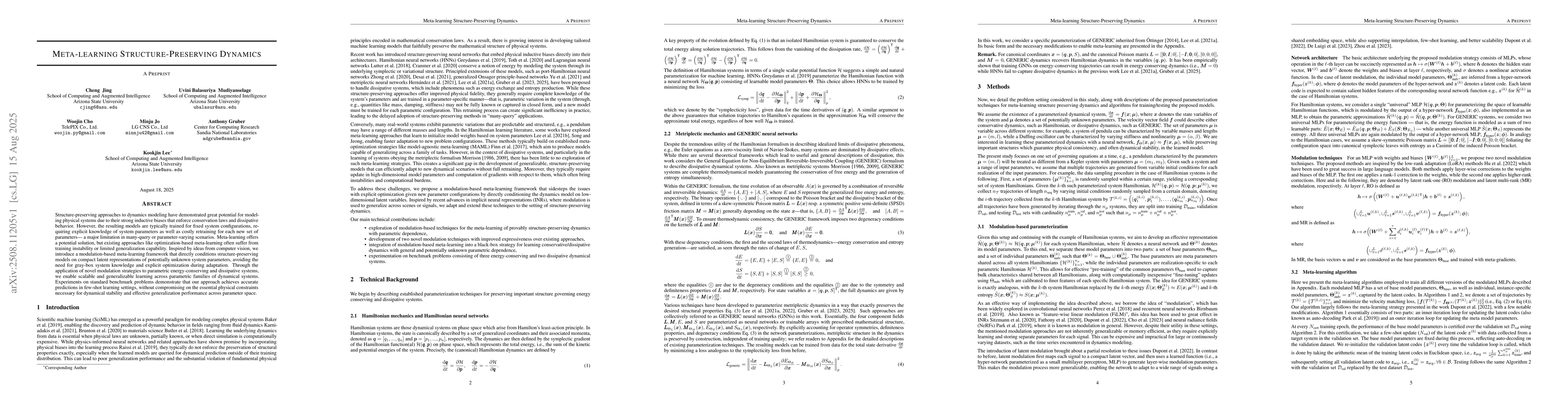 Structure-preserving approaches to dynamics modeling have demonstrated great potential for modeling physical systems due to their strong inductive biases that enforce conservation laws and dissipative behavior. However, the resulting models are typically trained for fixed system configurations, requiring explicit knowledge of system parameters as well as costly retraining for each new set of parameters -- a major limitation in many-query or parameter-varying scenarios. Meta-learning offers a potential solution, but existing approaches like optimization-based meta-learning often suffer from training instability or limited generalization capability. Inspired by ideas from computer vision, we introduce a modulation-based meta-learning framework that directly conditions structure-preserving models on compact latent representations of potentially unknown system parameters, avoiding the need for gray-box system knowledge and explicit optimization during adaptation. Through the application of novel modulation strategies to parametric energy-conserving and dissipative systems, we enable scalable and generalizable learning across parametric families of dynamical systems. Experiments on standard benchmark problems demonstrate that our approach achieves accurate predictions in few-shot learning settings, without compromising on the essential physical constraints necessary for dynamical stability and effective generalization performance across parameter space.