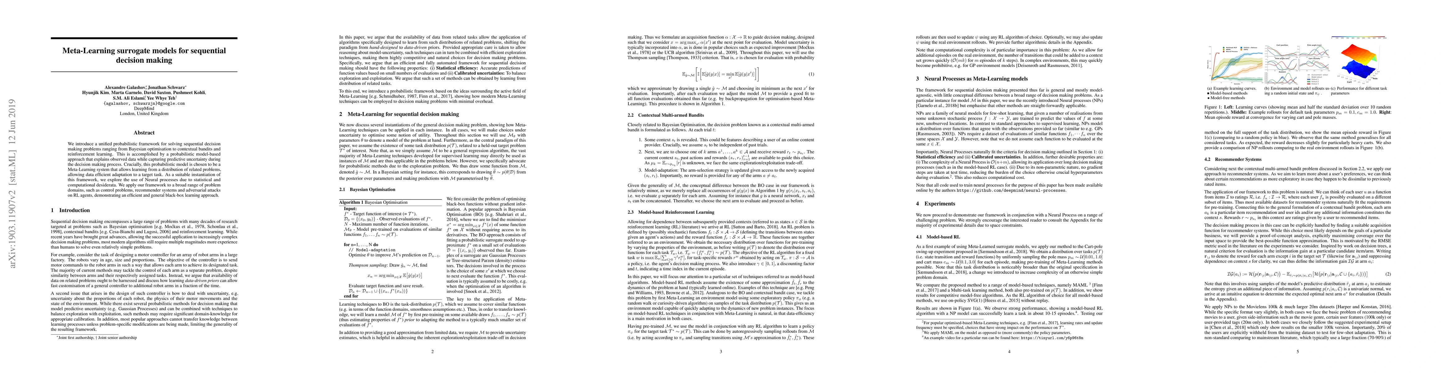 This paper proposes a meta-learning framework using probabilistic models and neural processes to efficiently solve sequential decision making problems like Bayesian optimization and reinforcement learning across various domains. The approach enables data-efficient adaptation by learning from related problem distributions.