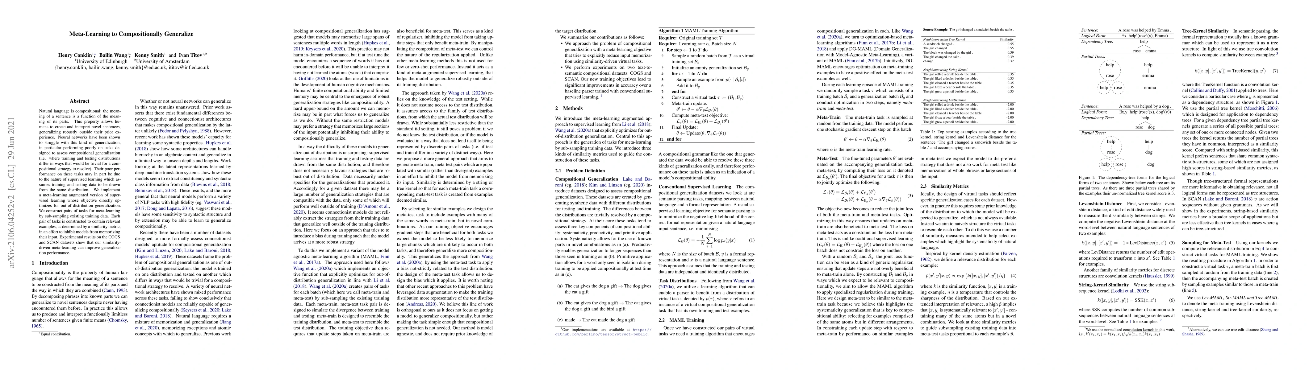 Natural language is compositional; the meaning of a sentence is a function of the meaning of its parts. This property allows humans to create and interpret novel sentences, generalizing robustly outside their prior experience. Neural networks have been shown to struggle with this kind of generalization, in particular performing poorly on tasks designed to assess compositional generalization (i.e. where training and testing distributions differ in ways that would be trivial for a compositional strategy to resolve). Their poor performance on these tasks may in part be due to the nature of supervised learning which assumes training and testing data to be drawn from the same distribution. We implement a meta-learning augmented version of supervised learning whose objective directly optimizes for out-of-distribution generalization. We construct pairs of tasks for meta-learning by sub-sampling existing training data. Each pair of tasks is constructed to contain relevant examples, as determined by a similarity metric, in an effort to inhibit models from memorizing their input. Experimental results on the COGS and SCAN datasets show that our similarity-driven meta-learning can improve generalization performance.