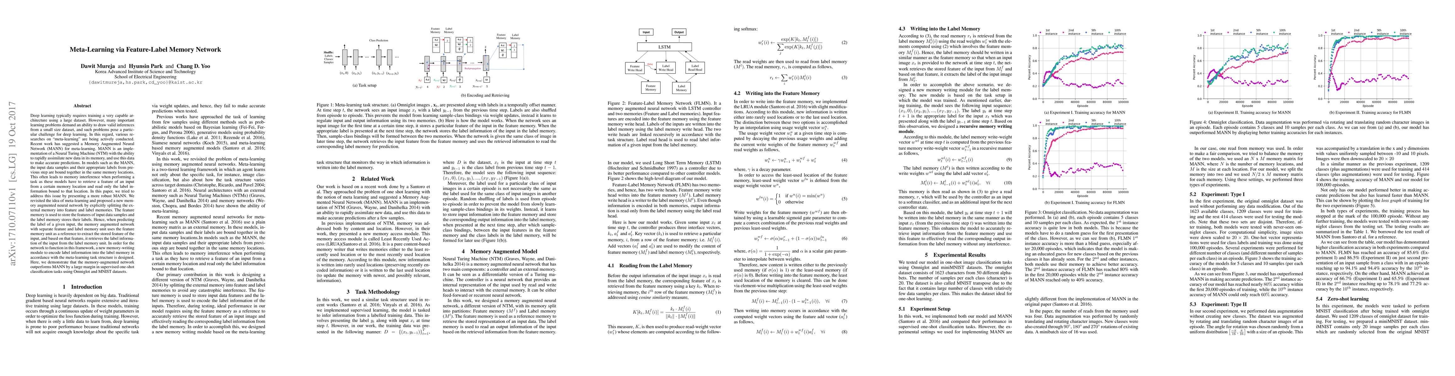 This paper proposes a new memory augmented neural network to address memory interference in meta-learning models like MANN. It splits the external memory into separate feature and label memories, improving performance in one-shot classification tasks on Omniglot and MNIST datasets.