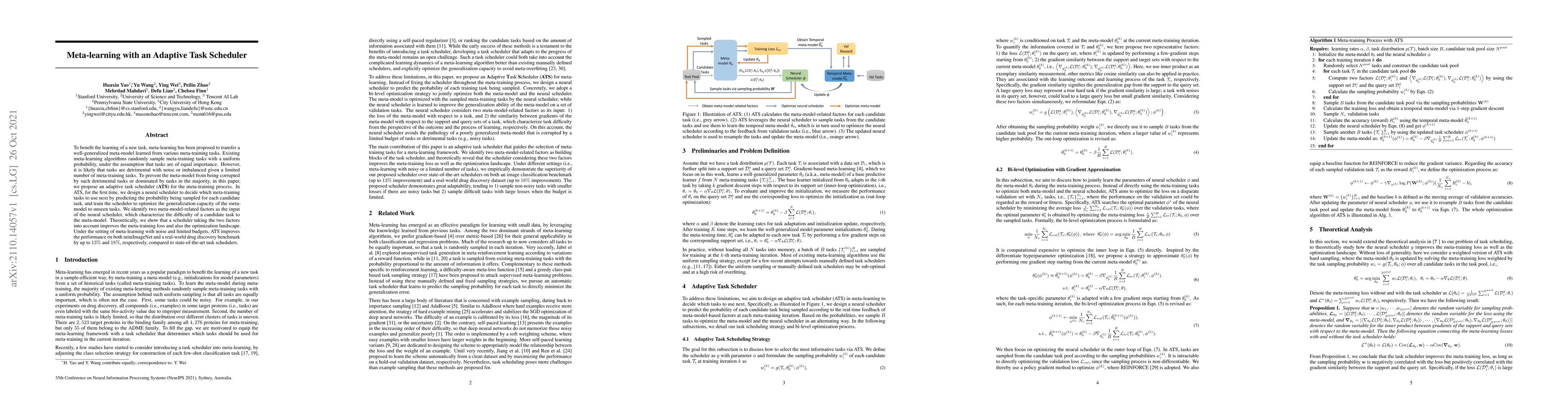 This paper proposes an adaptive task scheduler (ATS) for meta-learning that uses a neural scheduler to select meta-training tasks based on their predicted importance, optimizing the meta-model's generalization. ATS improves performance on miniImageNet and a drug discovery benchmark by up to 13% and 18% respectively, compared to existing methods.