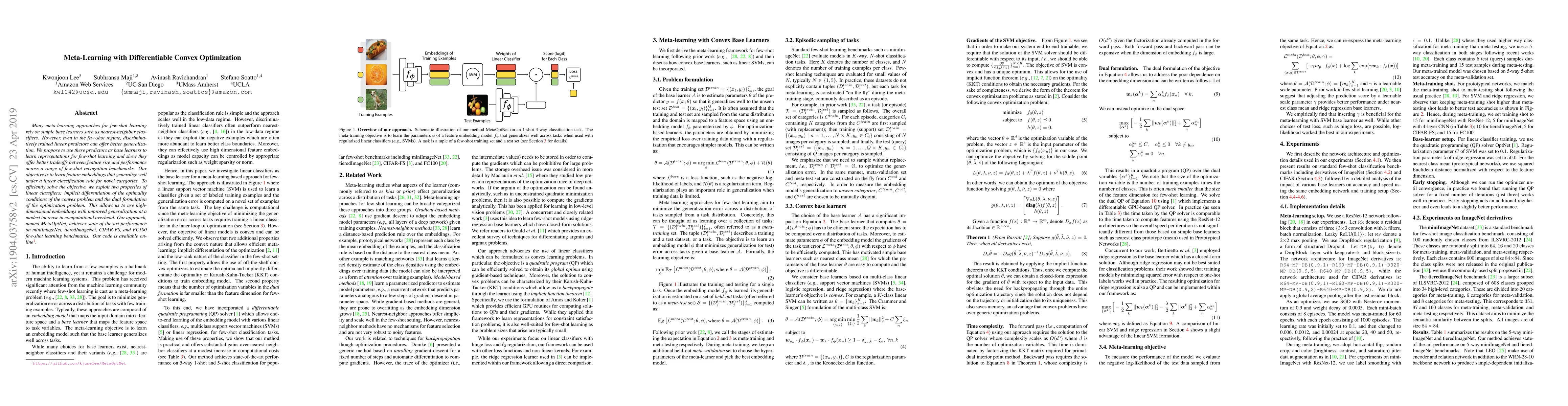 Many meta-learning approaches for few-shot learning rely on simple base learners such as nearest-neighbor classifiers. However, even in the few-shot regime, discriminatively trained linear predictors can offer better generalization. We propose to use these predictors as base learners to learn representations for few-shot learning and show they offer better tradeoffs between feature size and performance across a range of few-shot recognition benchmarks. Our objective is to learn feature embeddings that generalize well under a linear classification rule for novel categories. To efficiently solve the objective, we exploit two properties of linear classifiers: implicit differentiation of the optimality conditions of the convex problem and the dual formulation of the optimization problem. This allows us to use high-dimensional embeddings with improved generalization at a modest increase in computational overhead. Our approach, named MetaOptNet, achieves state-of-the-art performance on miniImageNet, tieredImageNet, CIFAR-FS, and FC100 few-shot learning benchmarks. Our code is available at https://github.com/kjunelee/MetaOptNet.