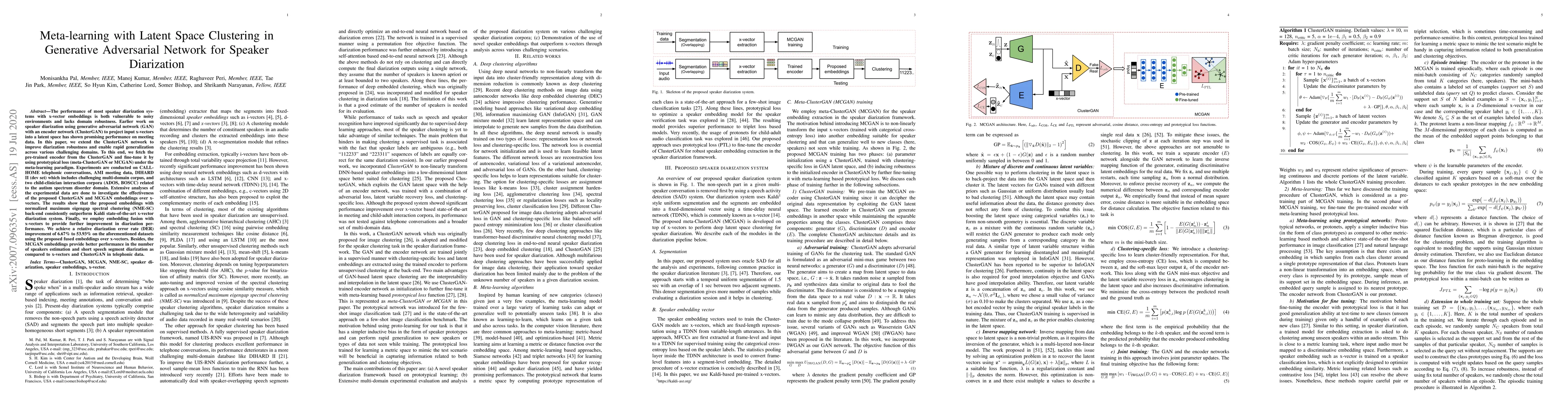 The proposed speaker embeddings were created using ClusterGAN with prototypical loss fine-tuning.