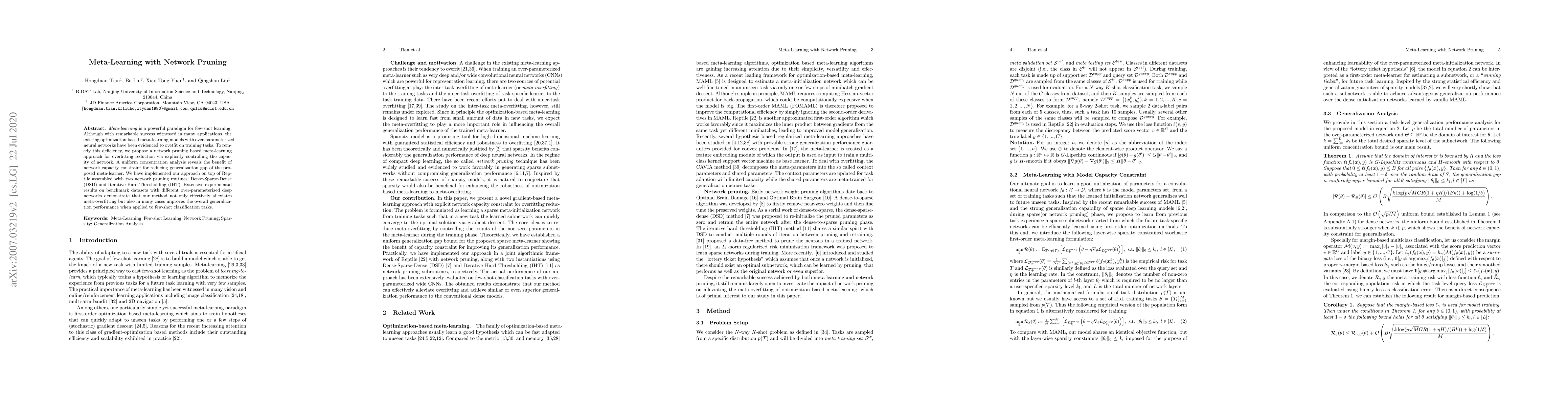 Meta-learning is a powerful paradigm for few-shot learning. Although with remarkable success witnessed in many applications, the existing optimization based meta-learning models with over-parameterized neural networks have been evidenced to ovetfit on training tasks. To remedy this deficiency, we propose a network pruning based meta-learning approach for overfitting reduction via explicitly controlling the capacity of network. A uniform concentration analysis reveals the benefit of network capacity constraint for reducing generalization gap of the proposed meta-learner. We have implemented our approach on top of Reptile assembled with two network pruning routines: Dense-Sparse-Dense (DSD) and Iterative Hard Thresholding (IHT). Extensive experimental results on benchmark datasets with different over-parameterized deep networks demonstrate that our method not only effectively alleviates meta-overfitting but also in many cases improves the overall generalization performance when applied to few-shot classification tasks.