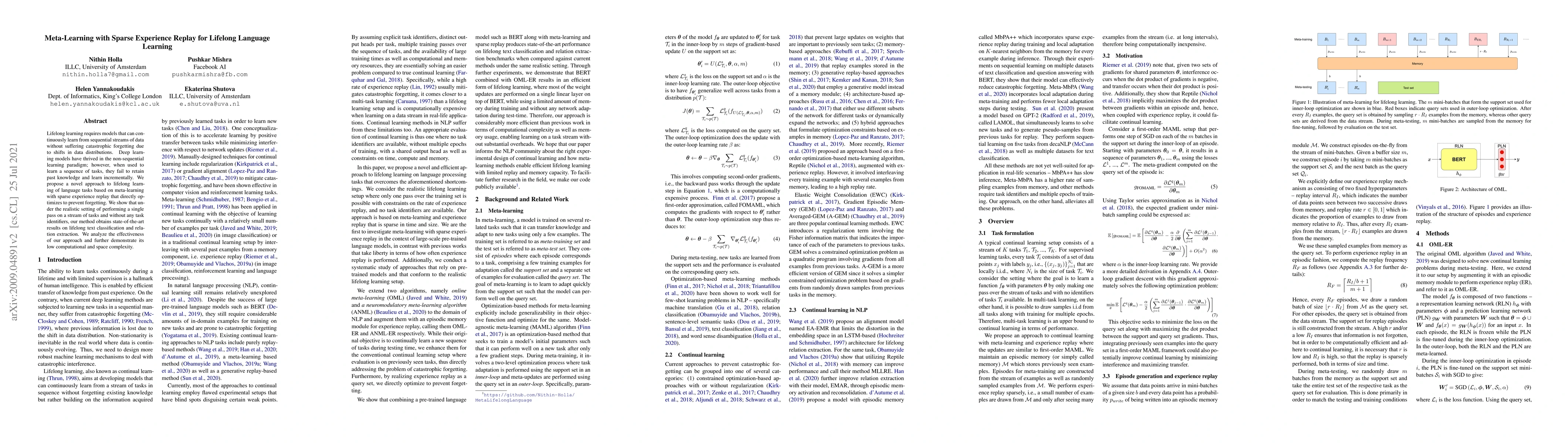 This paper proposes a meta-learning approach with sparse experience replay to enable lifelong learning for language tasks, effectively preventing catastrophic forgetting. The method achieves state-of-the-art results in text classification and relation extraction with minimal computational overhead.