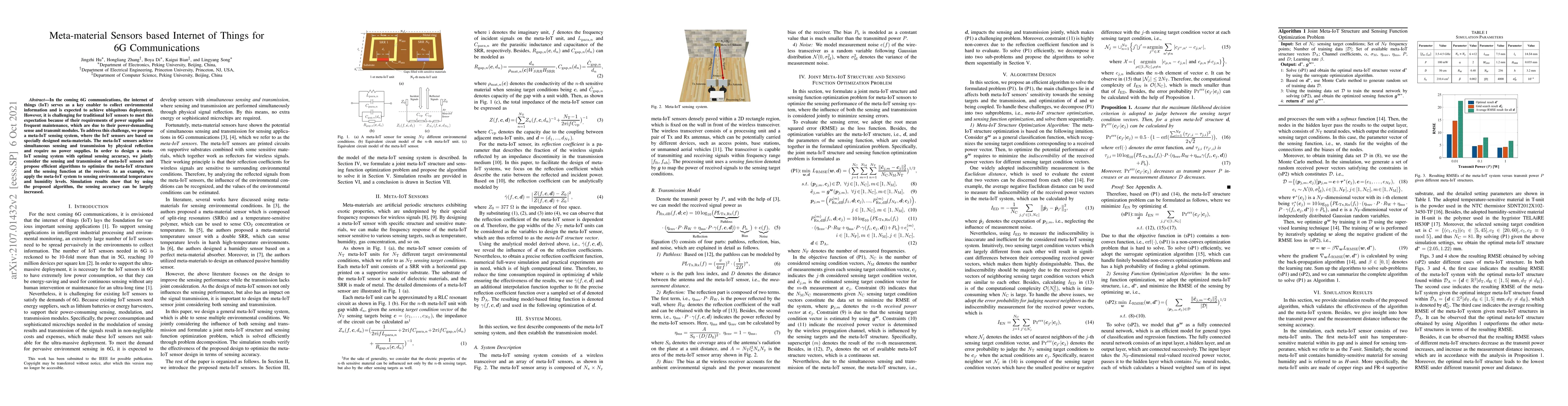 In the coming 6G communications, the internet of things (IoT) serves as a key enabler to collect environmental information and is expected to achieve ubiquitous deployment. However, it is challenging for traditional IoT sensors to meet this expectation because of their requirements of power supplies and frequent maintenance, which are due to their power-demanding sense and transmit modules. To address this challenge, we propose a meta-IoT sensing system, where the IoT sensors are based on specially designed meta-materials. The meta-IoT sensors achieve simultaneous sensing and transmission by physical reflection and require no power supplies. In order to design a meta-IoT sensing system with optimal sensing accuracy, we jointly consider the sensing and transmission of meta-IoT sensors and propose efficient algorithms to optimize the meta-IoT structure and the sensing function at the receiver. As an example, we apply the meta-IoT system to sensing environmental temperature and humidity levels. Simulation results show that by using the proposed algorithm, the sensing accuracy can be largely increased.