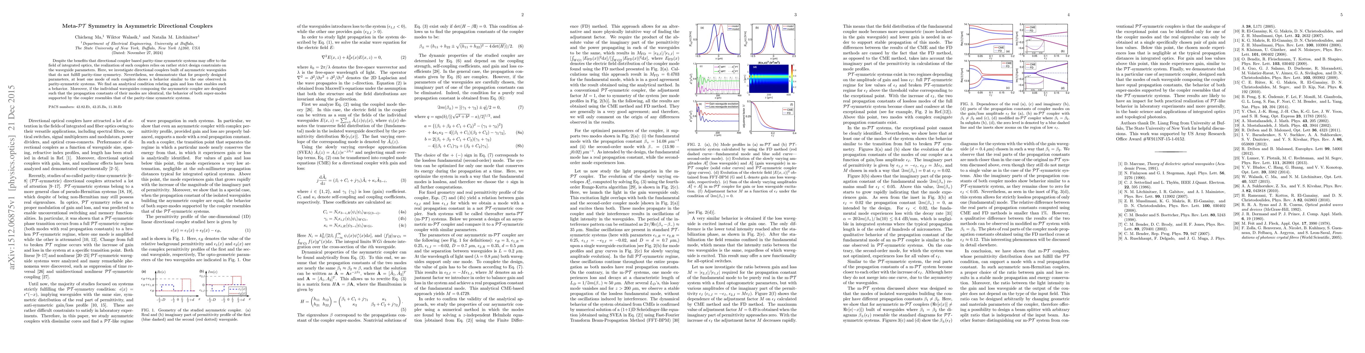 This paper explores asymmetric directional couplers that do not adhere to parity-time symmetry but still exhibit behavior akin to symmetric systems under specific conditions. An analytical condition linking gain and loss is identified to enable this meta-$\mathcal{PT}$ symmetry, and identical propagation constants in the waveguides further enhance this effect.
